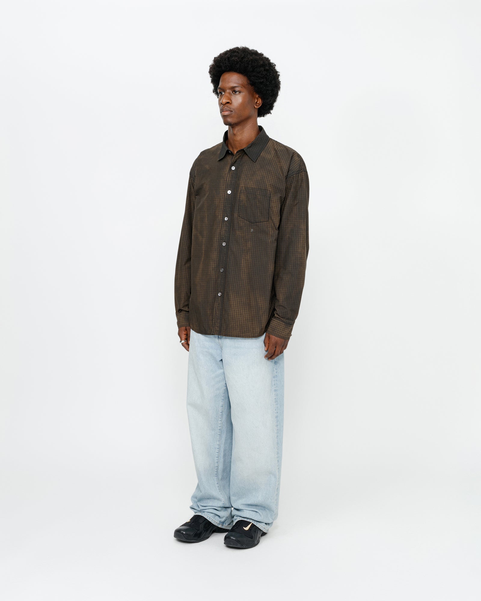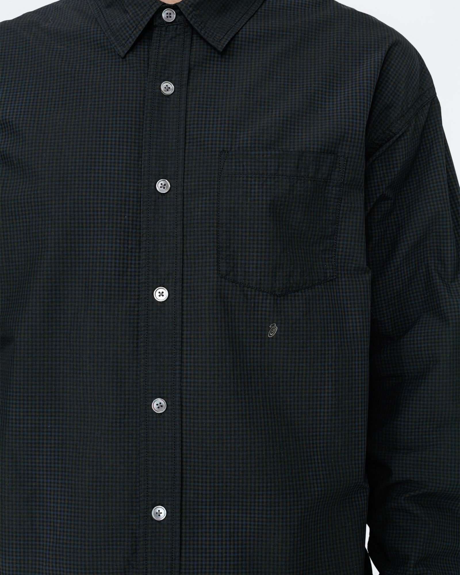 Classic fit shirt in a washed cotton blend with spray dye treatment. Features mother-of-pearl buttoning at the topstitched placket and cuffs. swirly “S” embroidered below the patch pocket, and CORDURA flag label stitched at the side seam.