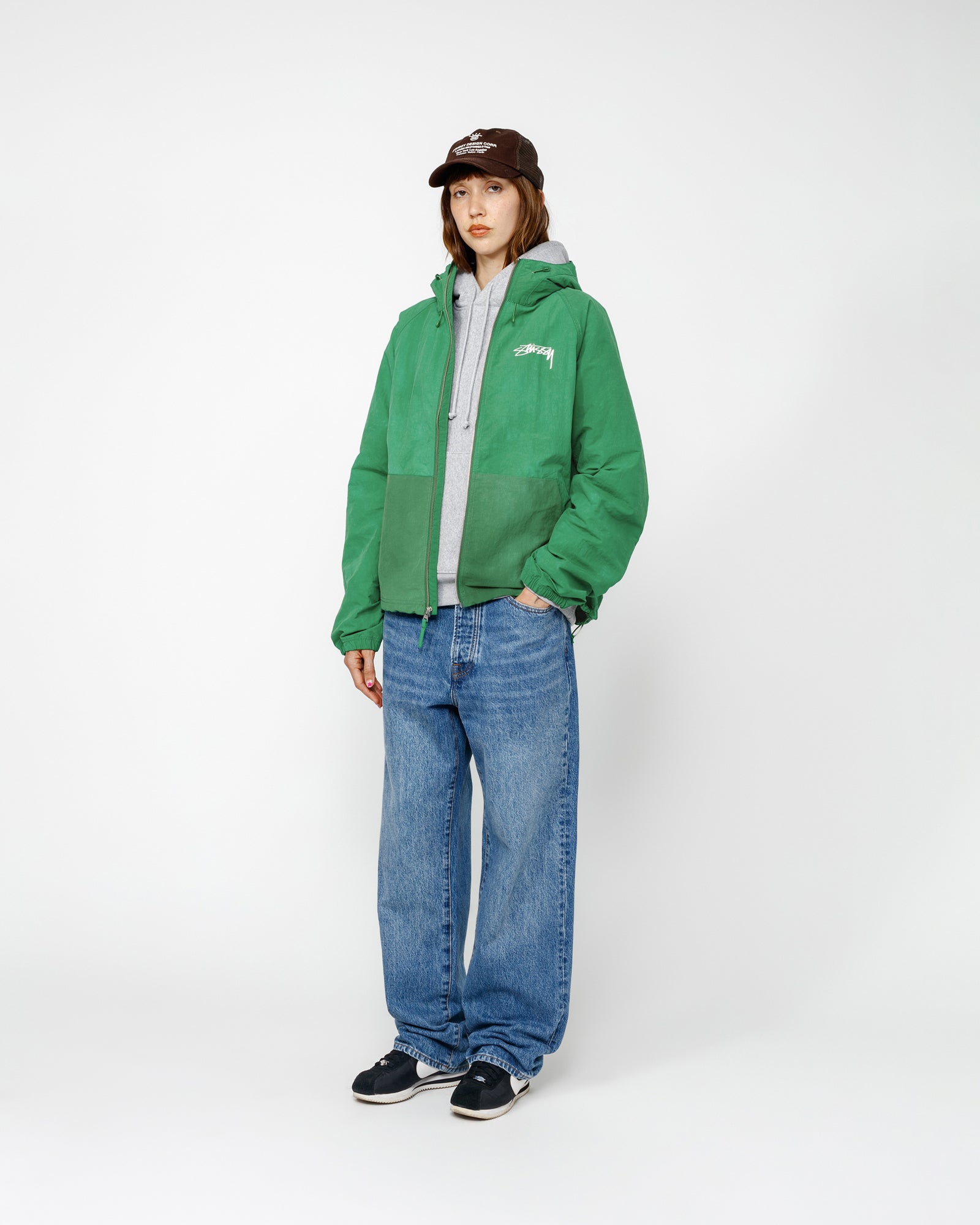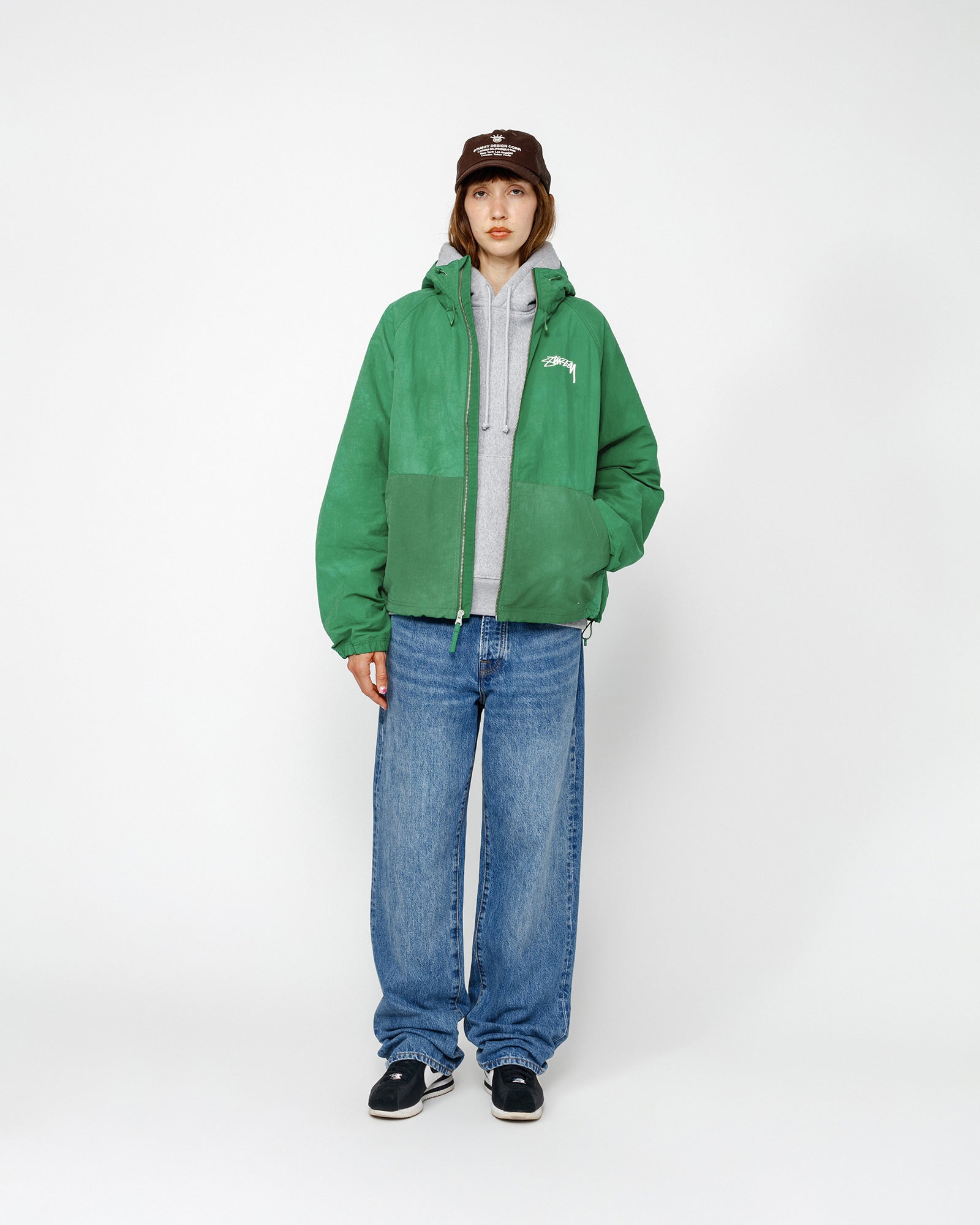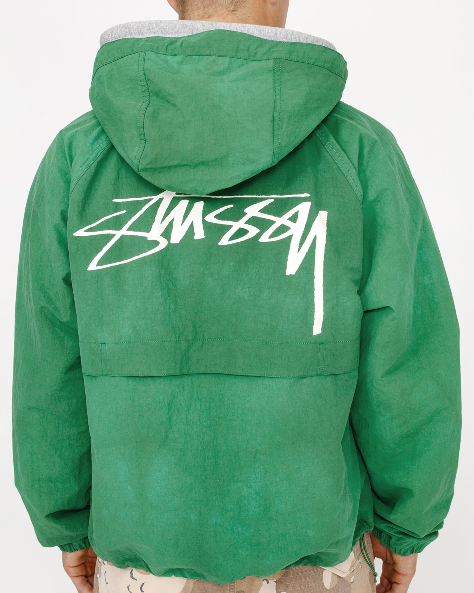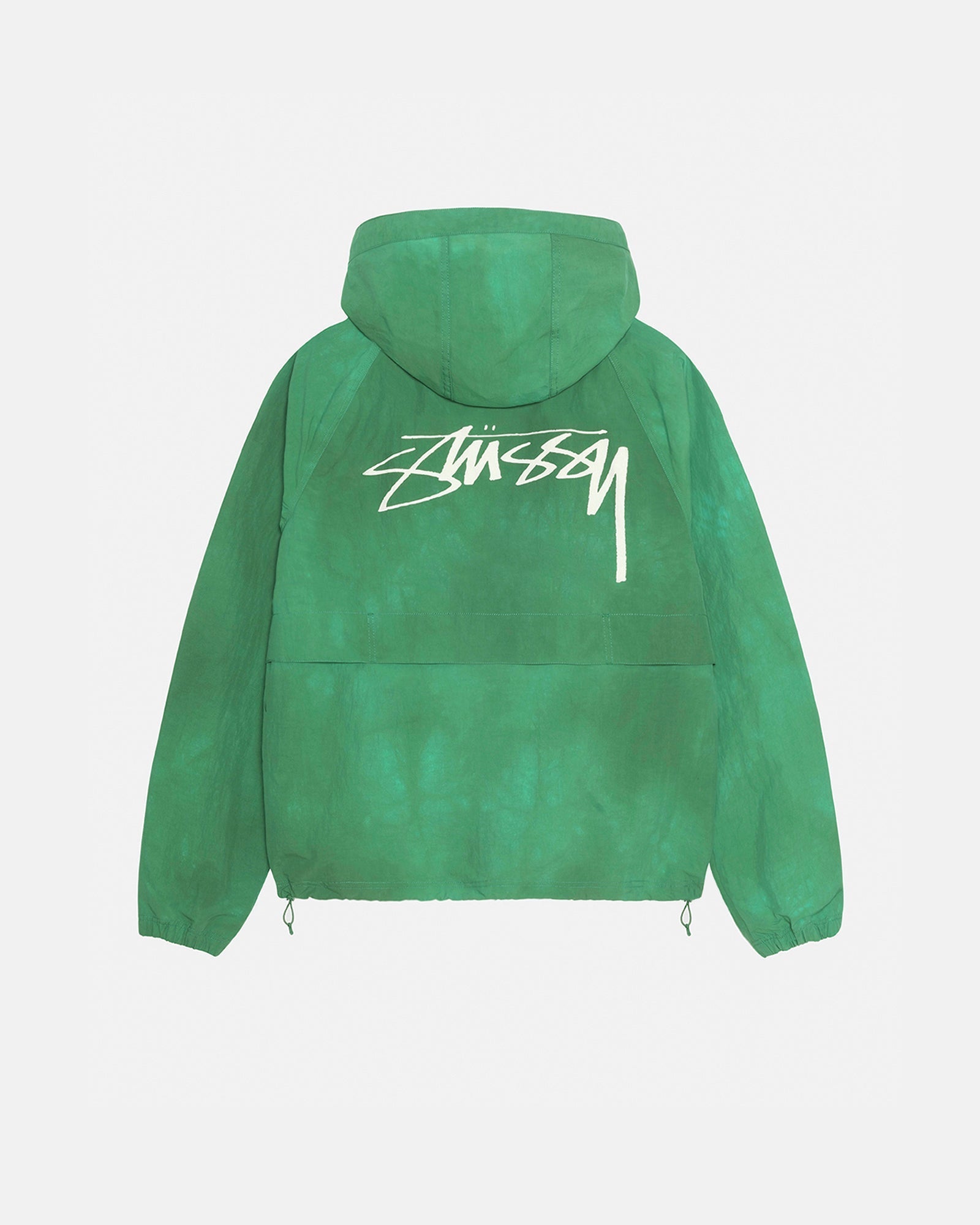 Relaxed shell jacket in textured wave dyed nylon. Features a front zip closure with adjustable drawcords in the hood and hem. smooth stock logo printed at the left chest and across the back.