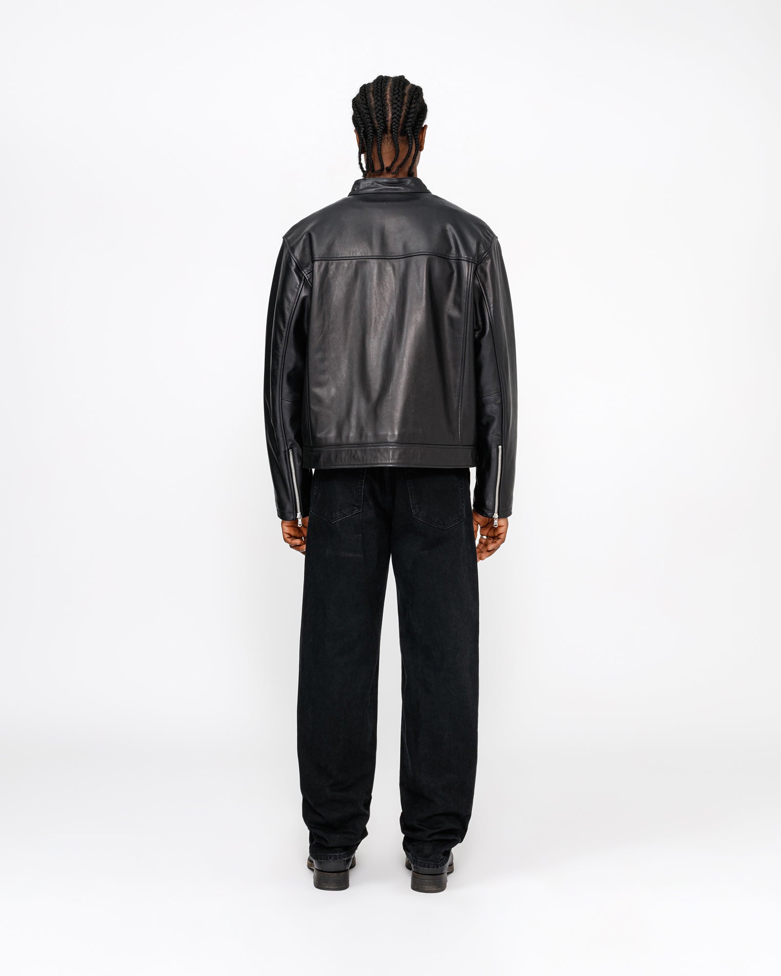 Classic fit racer jacket in heavy weight leather. Features an articulated sleeve and quilted lining.