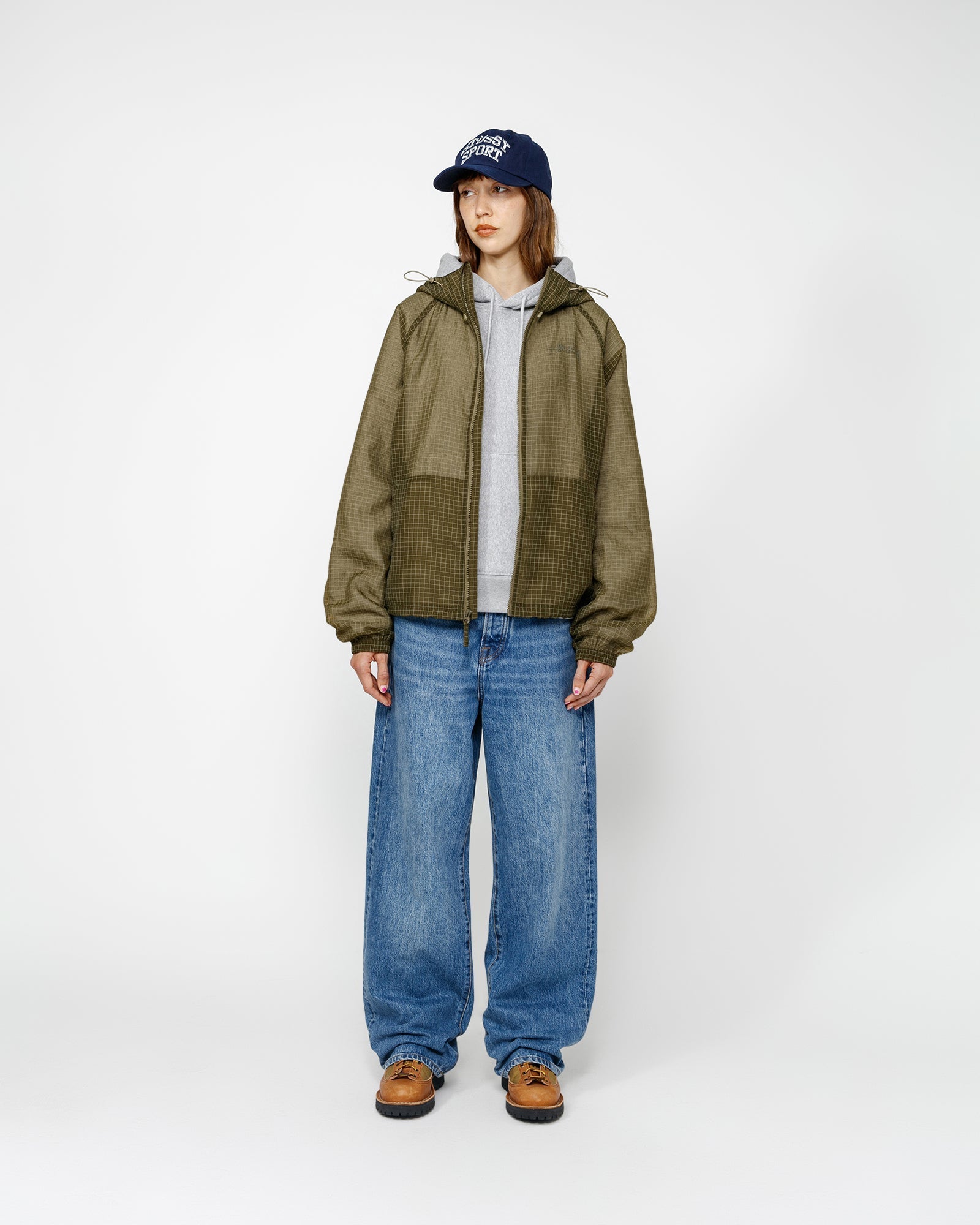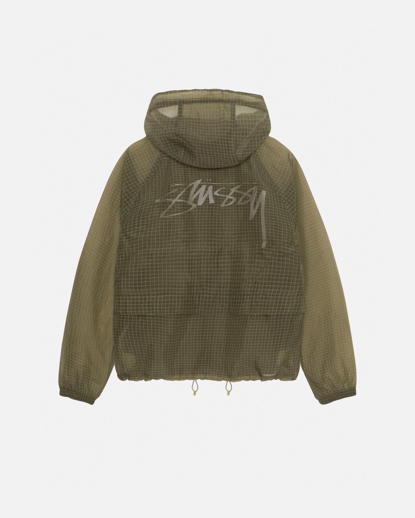 Relaxed shell jacket in transparent ripstop fabric. Features a front zip closure with adjustable drawcords in the hood and hem. Tonal smooth stock logo printed at the left chest and across the back.