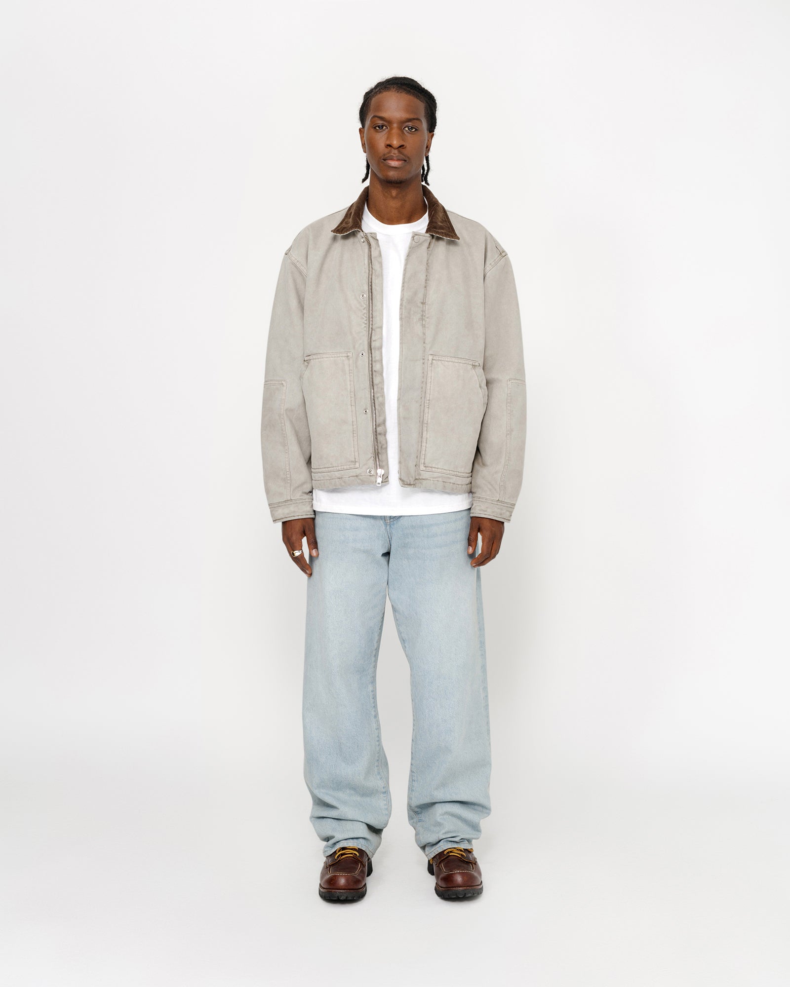 Work jacket in cotton canvas lined with quilted quilting. Boxy fit featuring a corduroy collar, concealed zip closure, patch pockets, and a garment dye with stonewash treatment. workgear label stitched at the side.