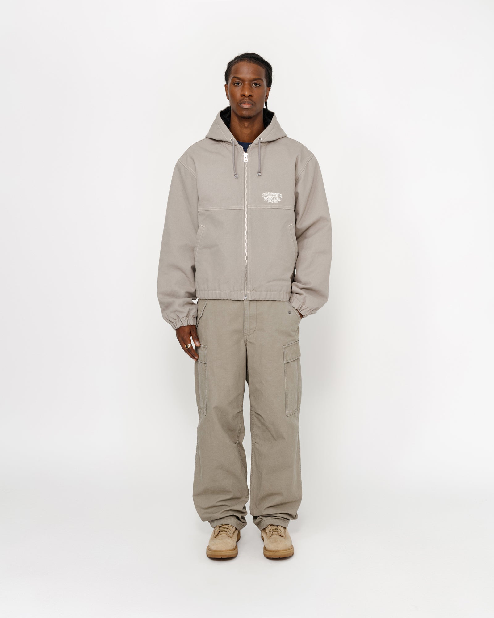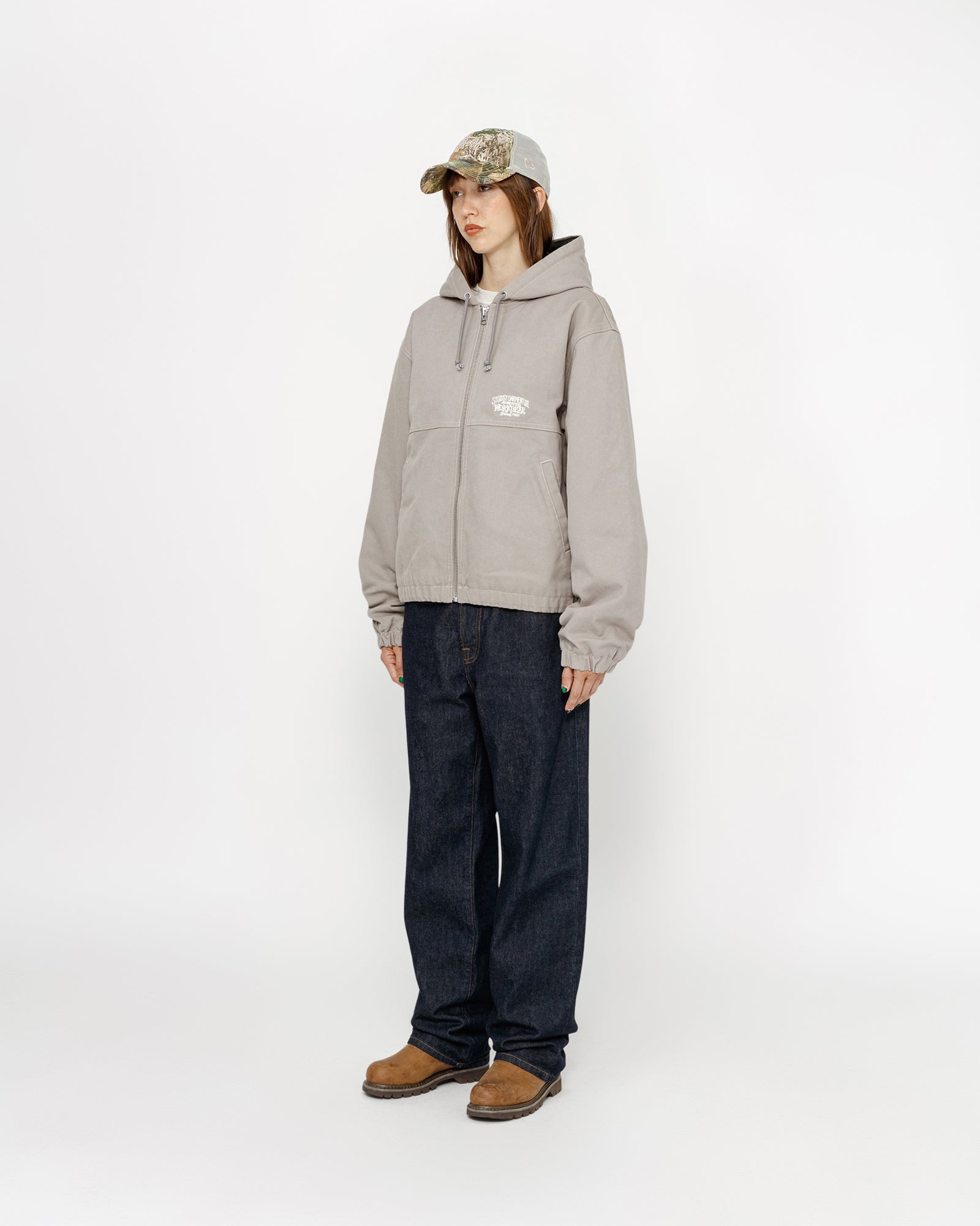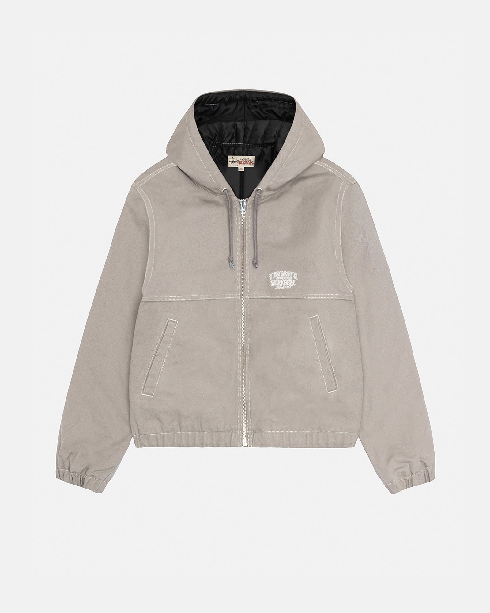 Hooded work jacket in cotton canvas with quilted satin lining. Boxy fit featuring a zip front closure, welt pockets, and contrast stitching. workgear embroidery at the back and chest.