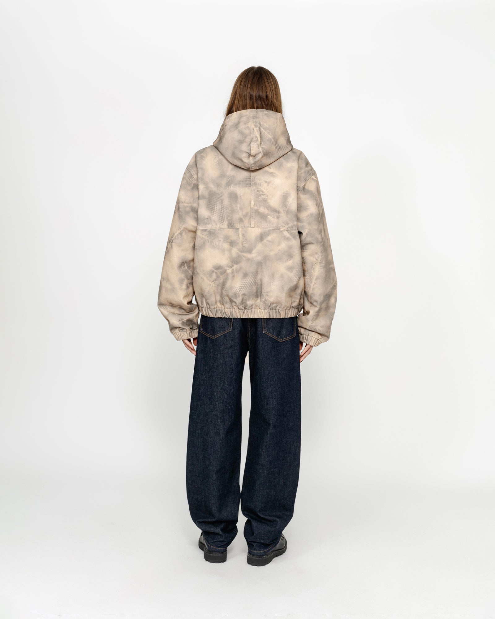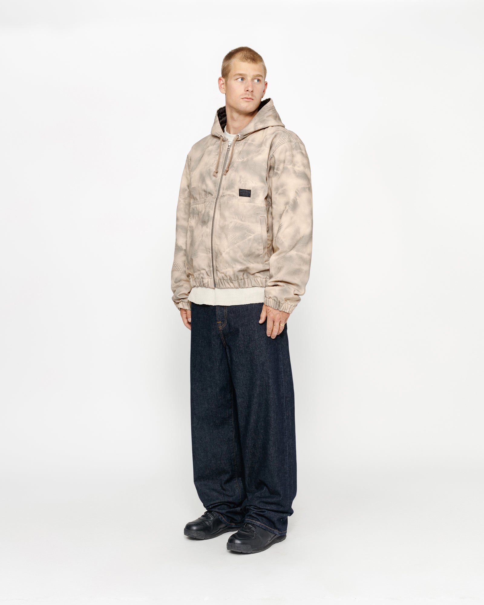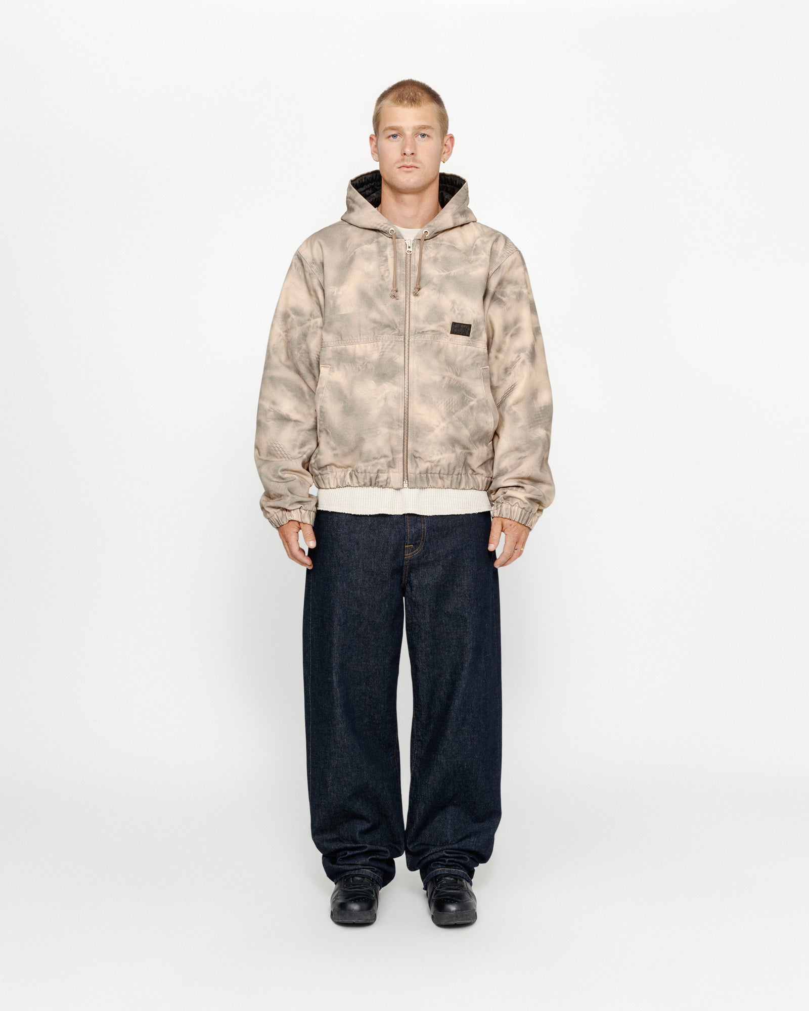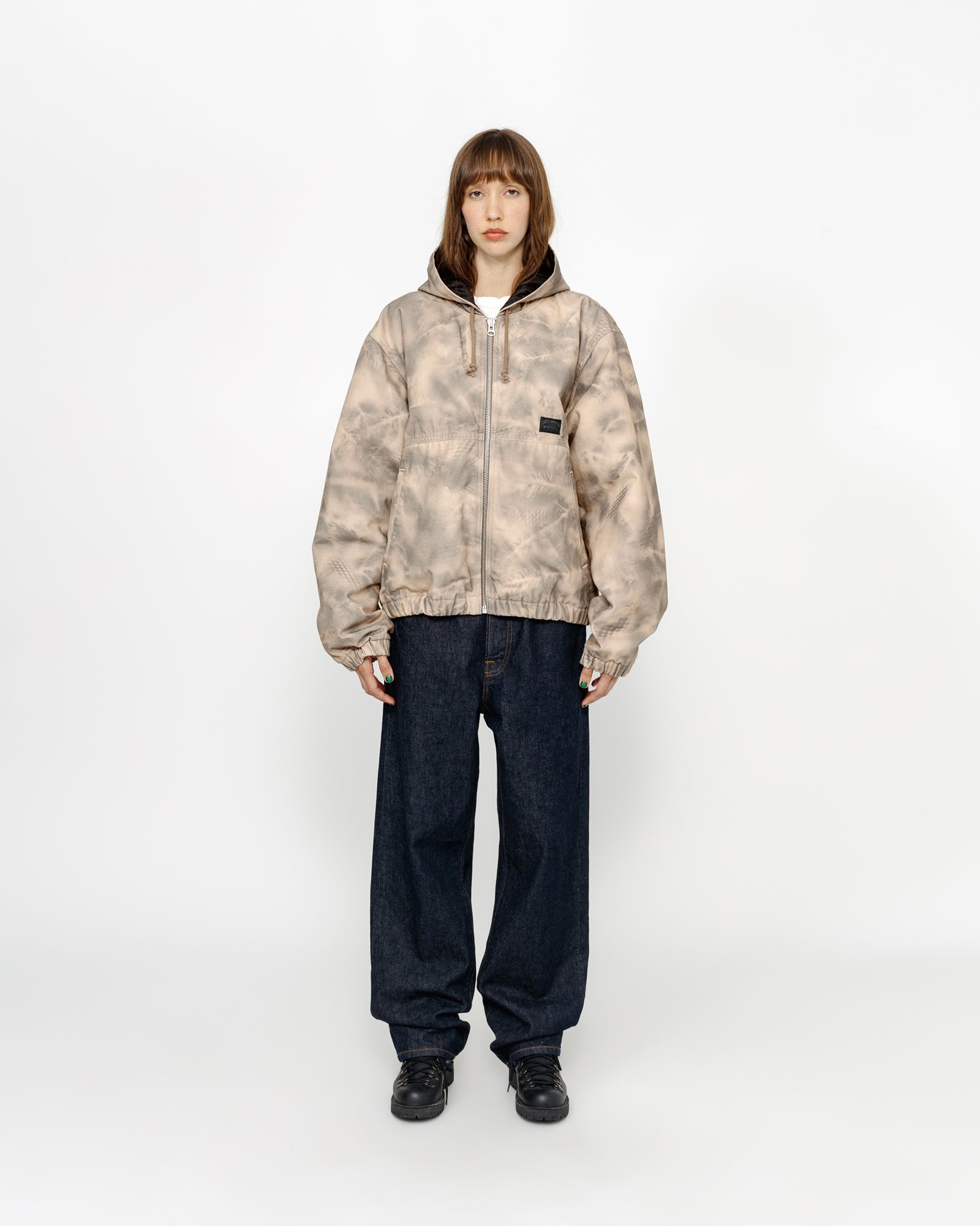 Hooded work jacket in printed cotton canvas with quilted satin lining. Custom stencil camo artwork developed by Caleb Flowers. Boxy fit featuring a zip front closure and welt pockets. workgear label woven at the front.