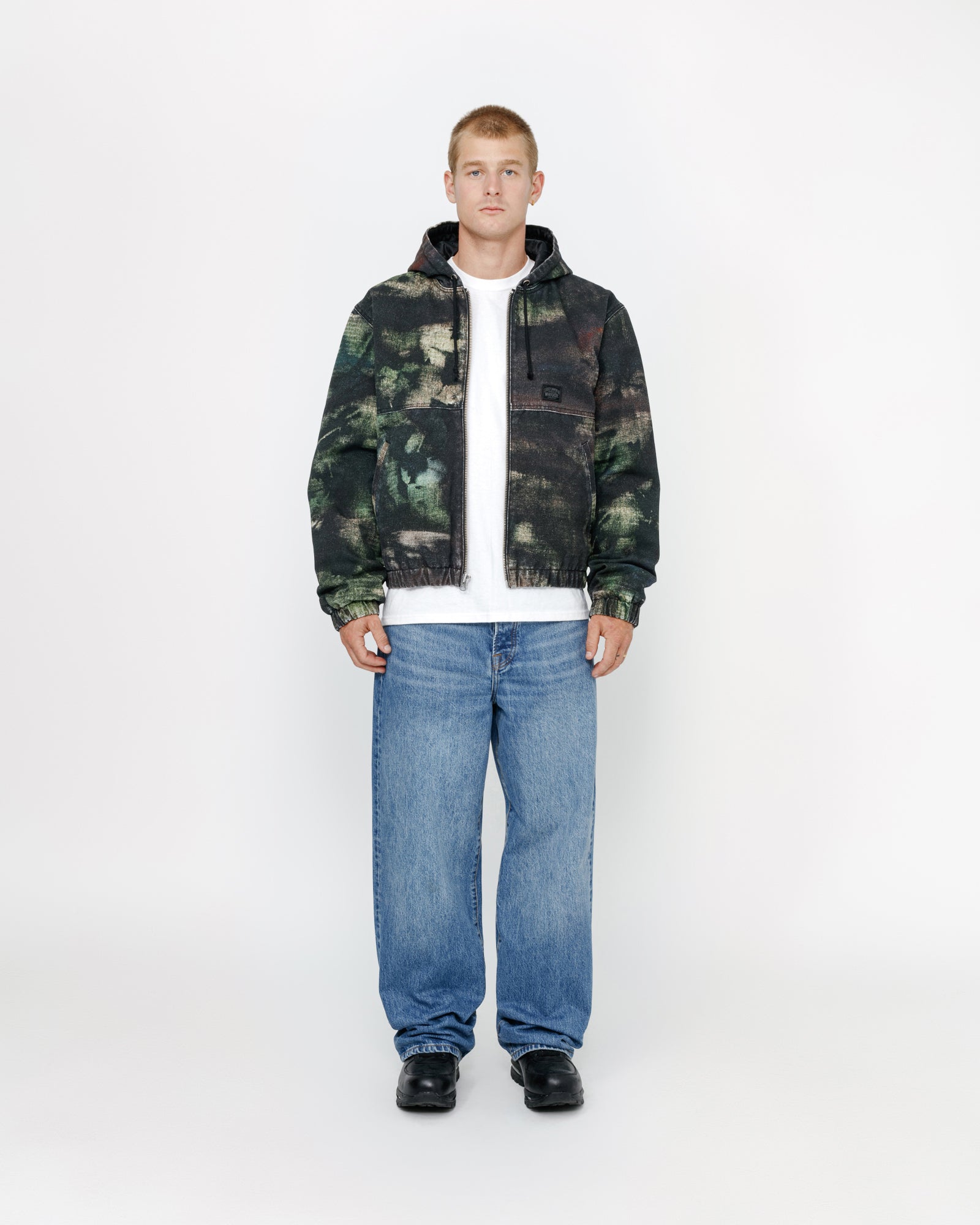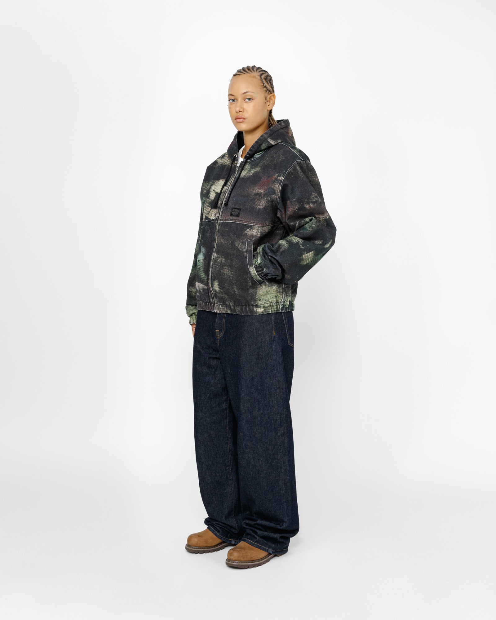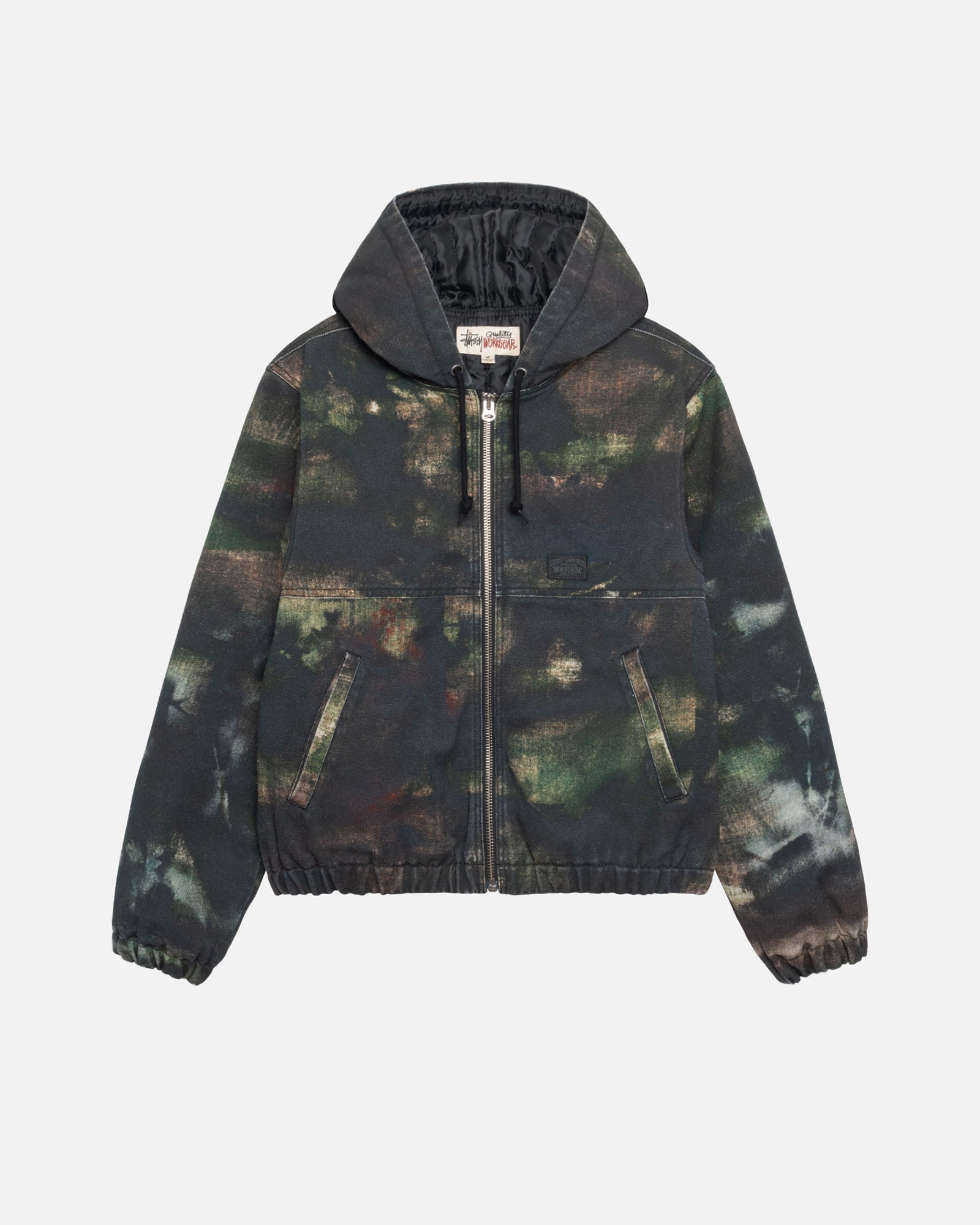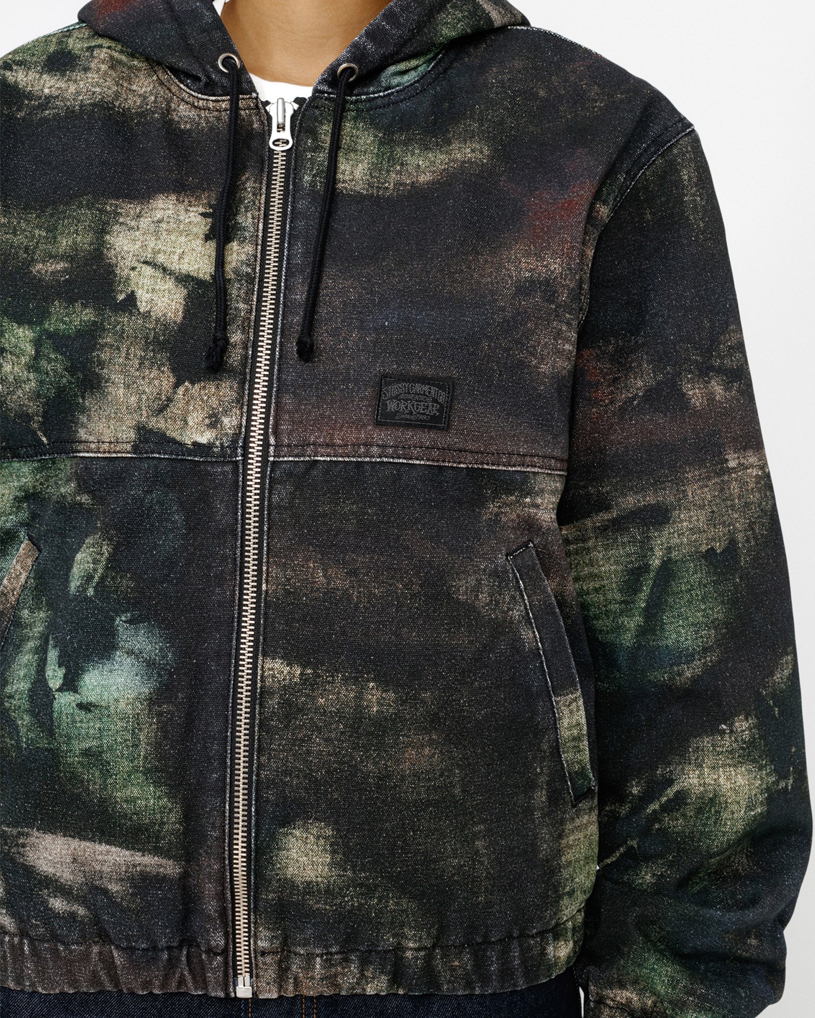 Hooded work jacket in printed cotton canvas with quilted satin lining. Custom stencil camo artwork developed by Caleb Flowers. Boxy fit featuring a zip front closure and welt pockets. workgear label woven at the front.