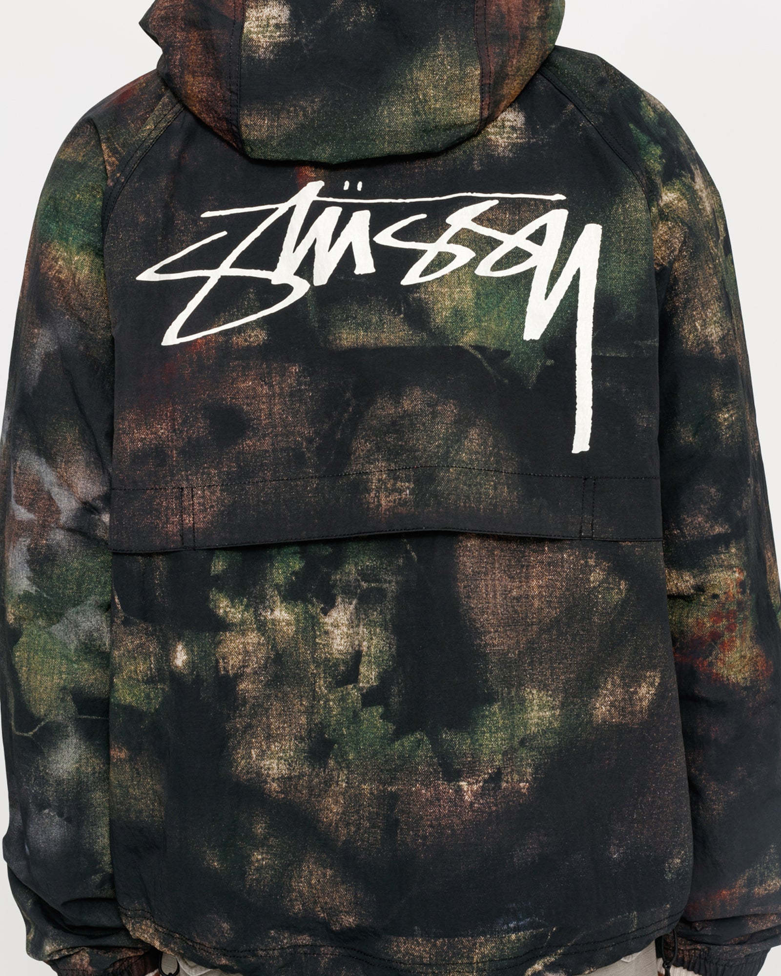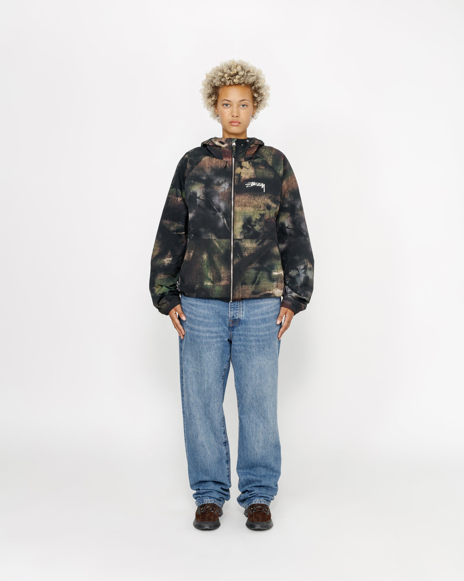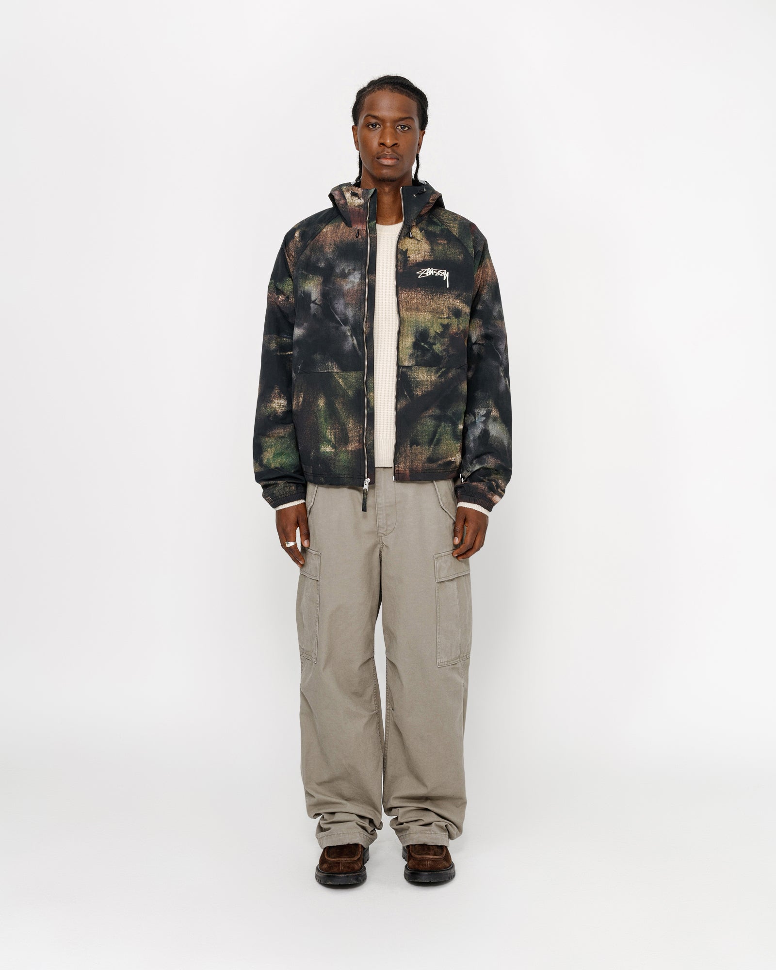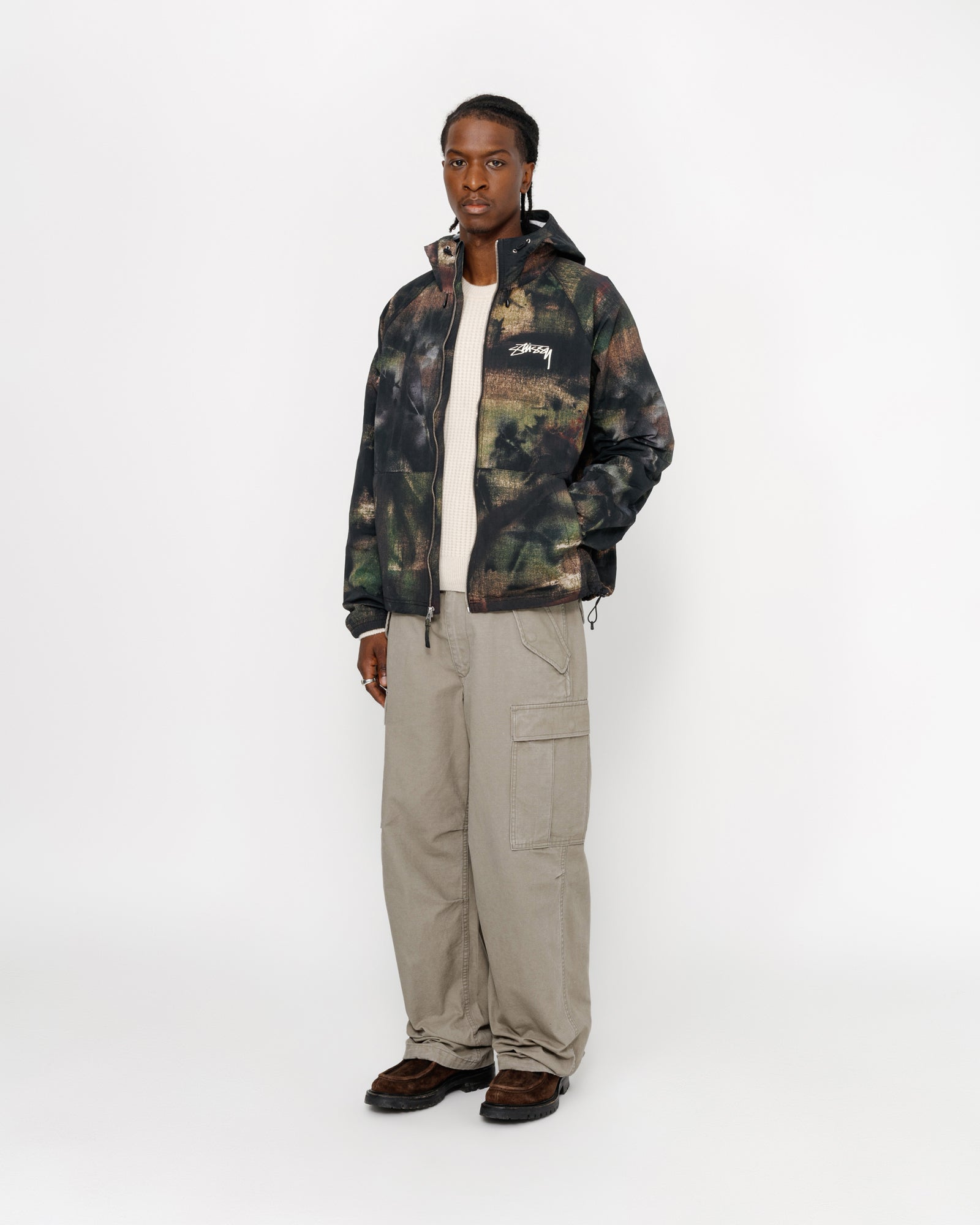Relaxed fit shell jacket in printed nylon. Custom stencil camo artwork developed by Caleb Flowers. Features a front zip closure with adjustable drawcords in the hood and hem. smooth stock logo screenprinted at the chest and back.