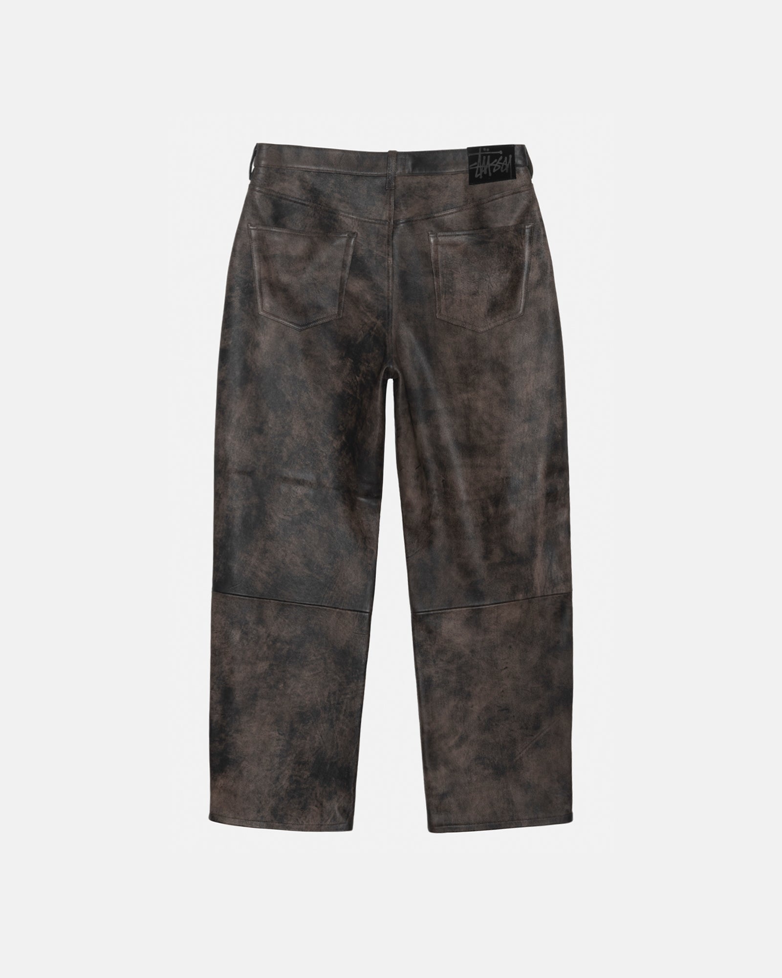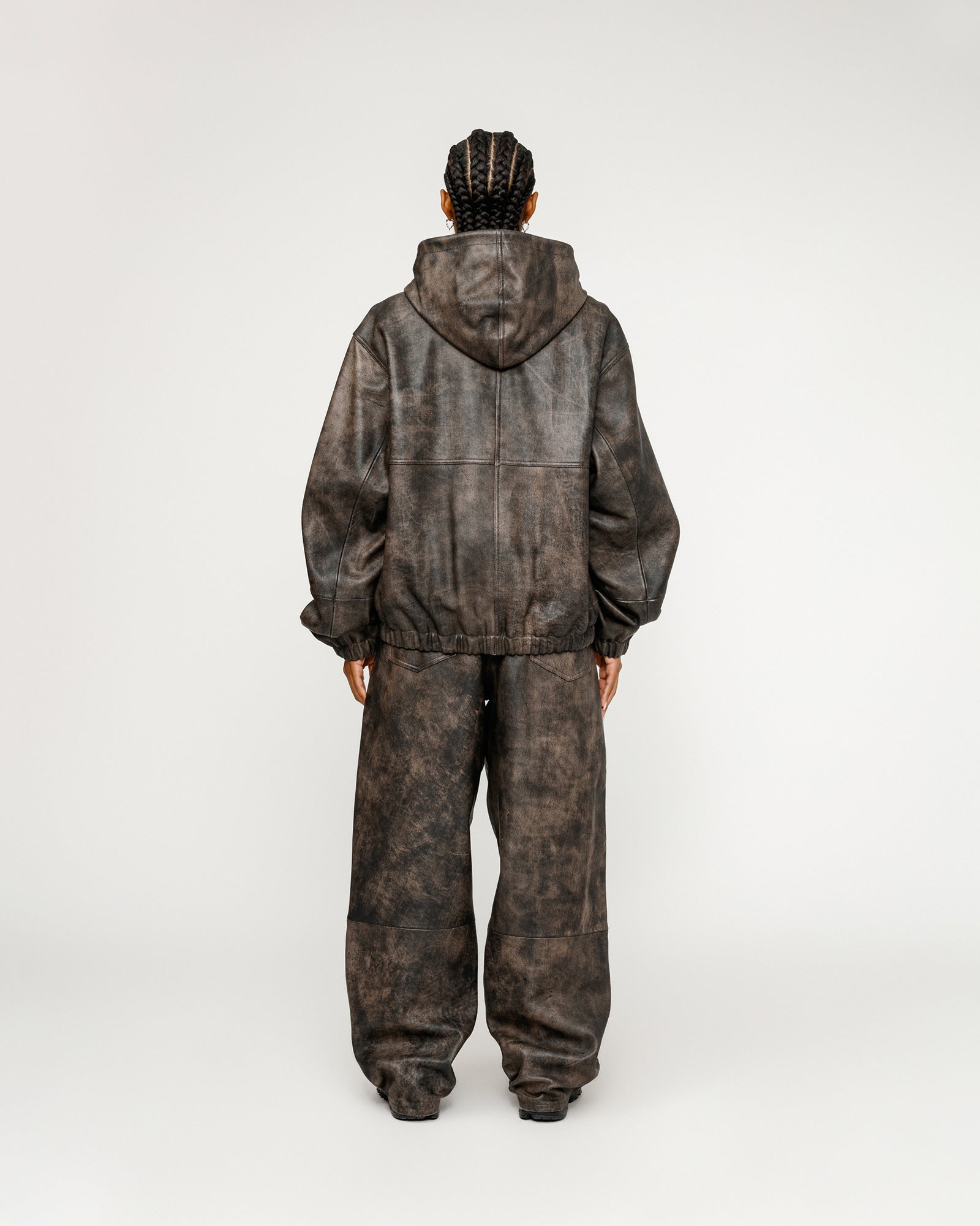 Baggy jean in stonewashed leather. Oversized with an extra wide cut that's roomy in the thigh and tapers to the cuff. Features branded nickel shank hardware, and a suede basic stock logo patch.