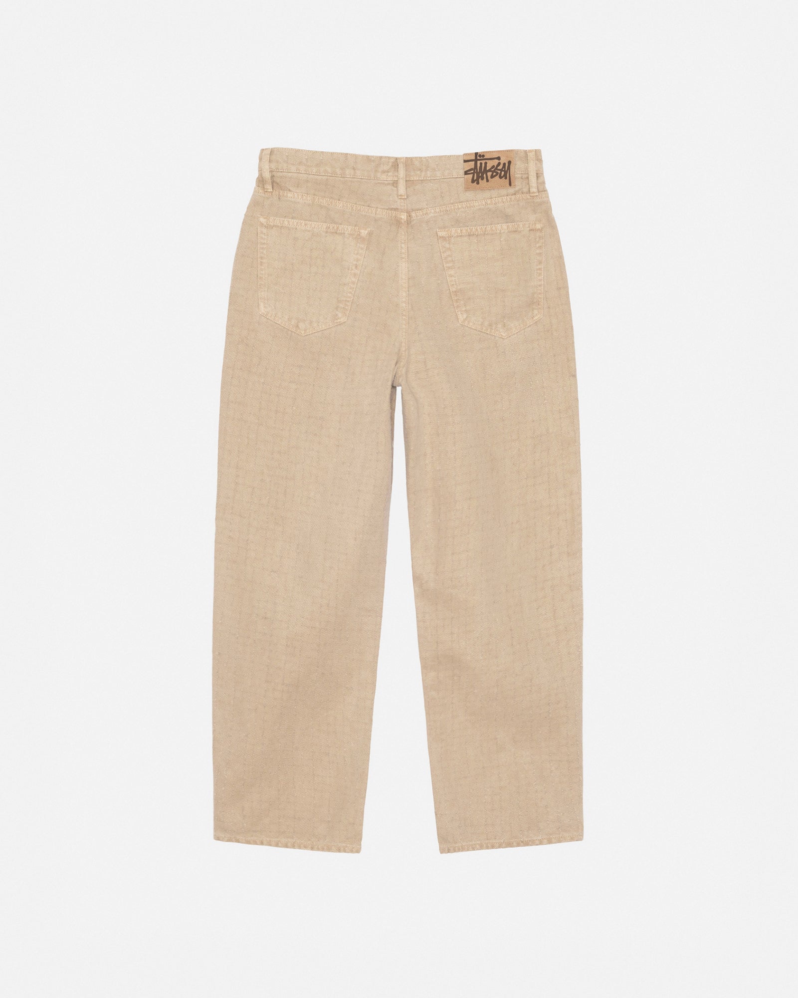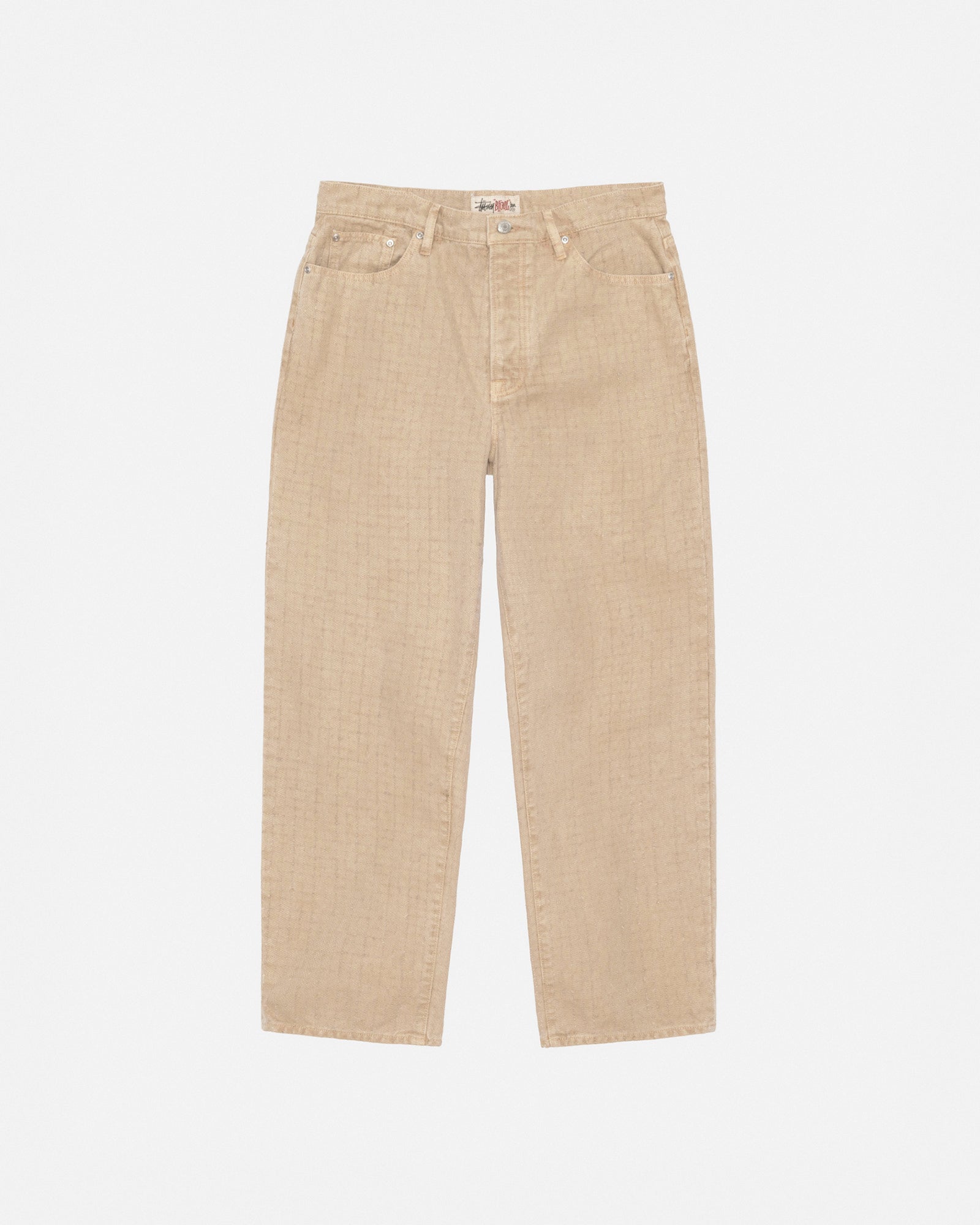 Baggy jean in washed cotton canvas with a needle punch effect. Oversized waist with a relaxed rise and roomy thigh that tapers to the cuff. Features branded nickel shank hardware and a suede logo patch. Size down for a true-to-size fit in the waist, or order your normal size for a baggier fit.