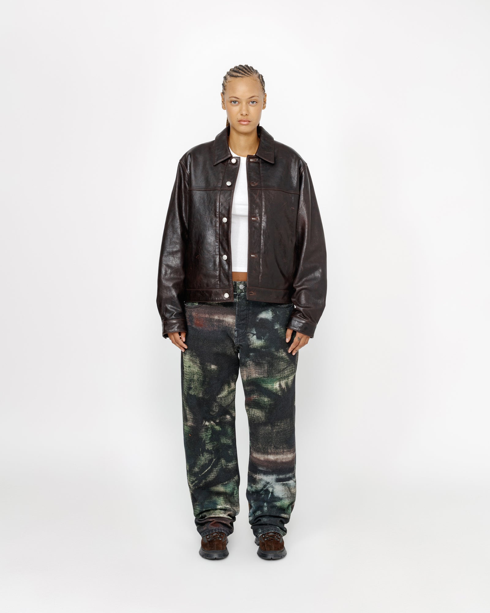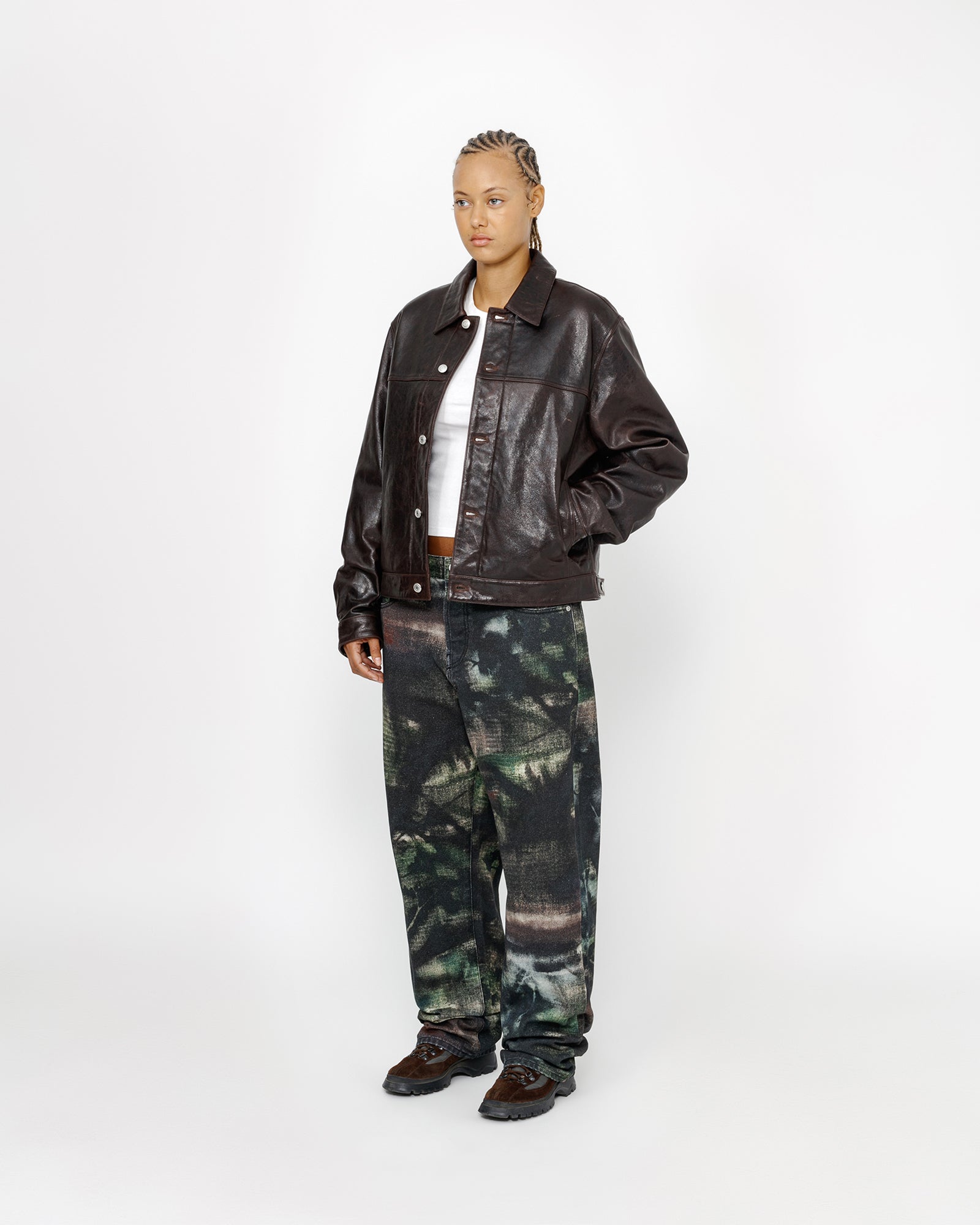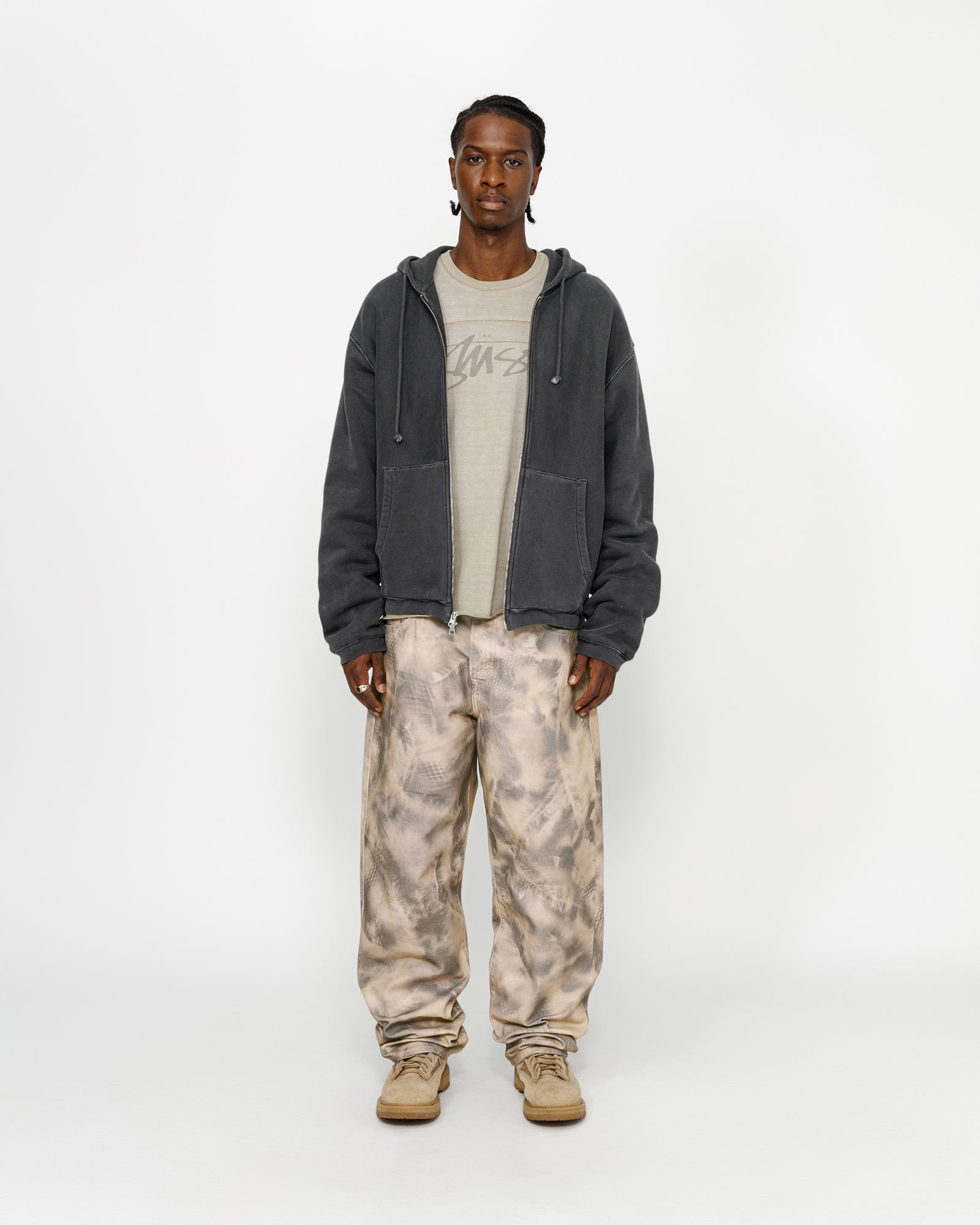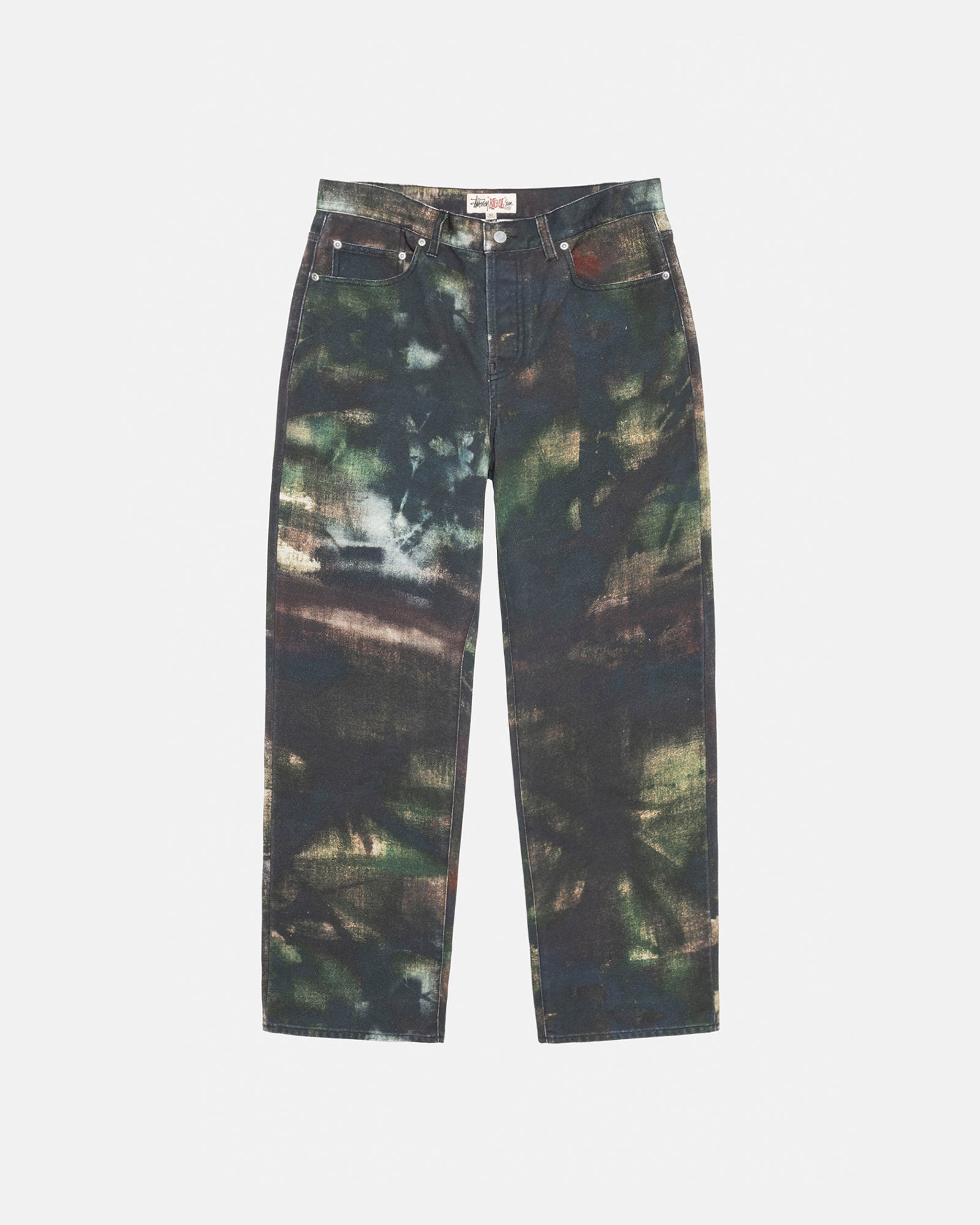 Baggy jean in printed cotton canvas. Custom stencil camo artwork developed by Caleb Flowers. Oversized waist with a relaxed rise and roomy thigh that tapers to the cuff. Features branded nickel shank hardware and a suede logo patch. Size down for a true-to-size fit in the waist, or order your normal size for a baggier fit.