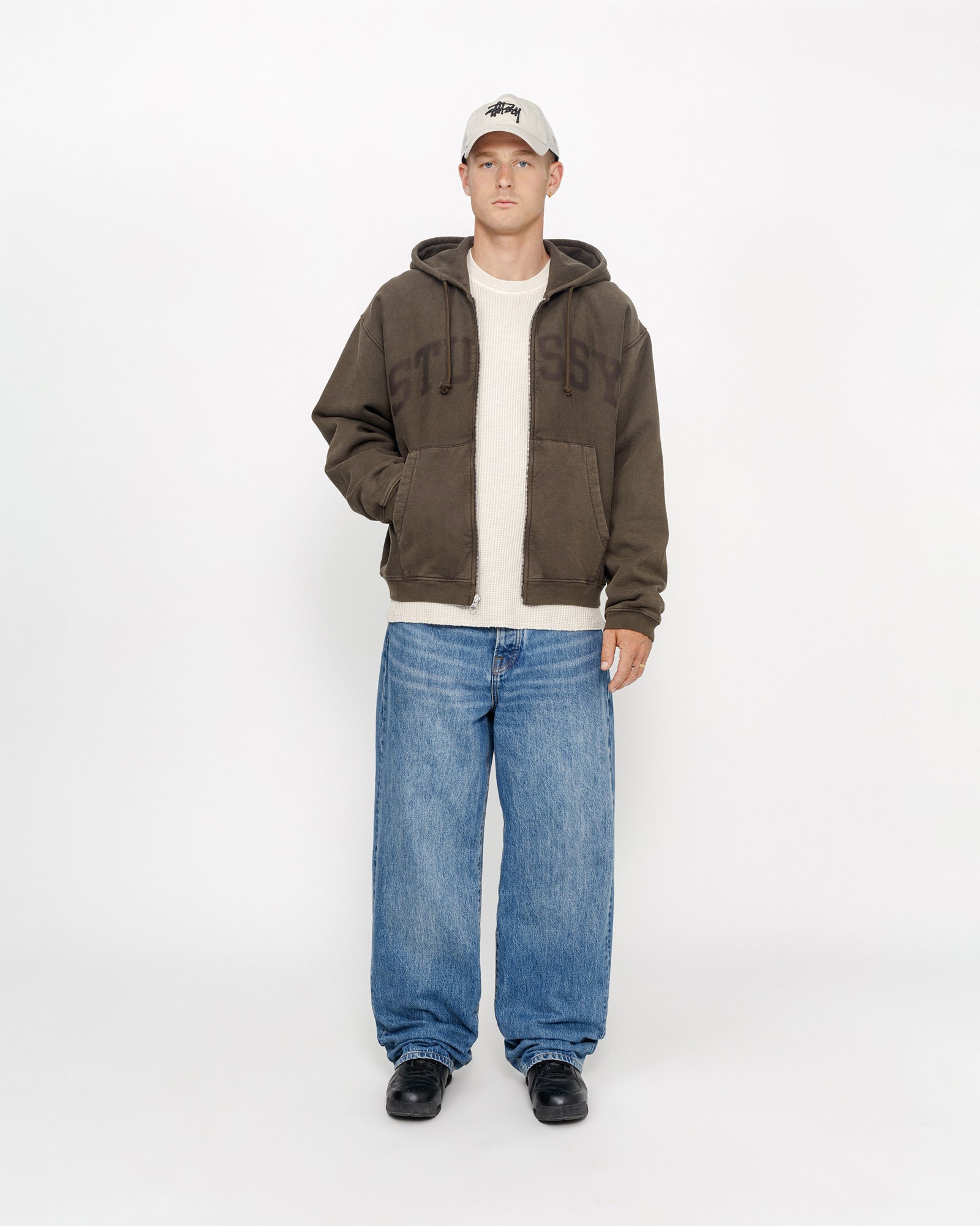 Zip-front hooded sweatshirt in a heavy 15.8oz cotton blend with a faded wash. Relaxed fit featuring the arch logo across the front.