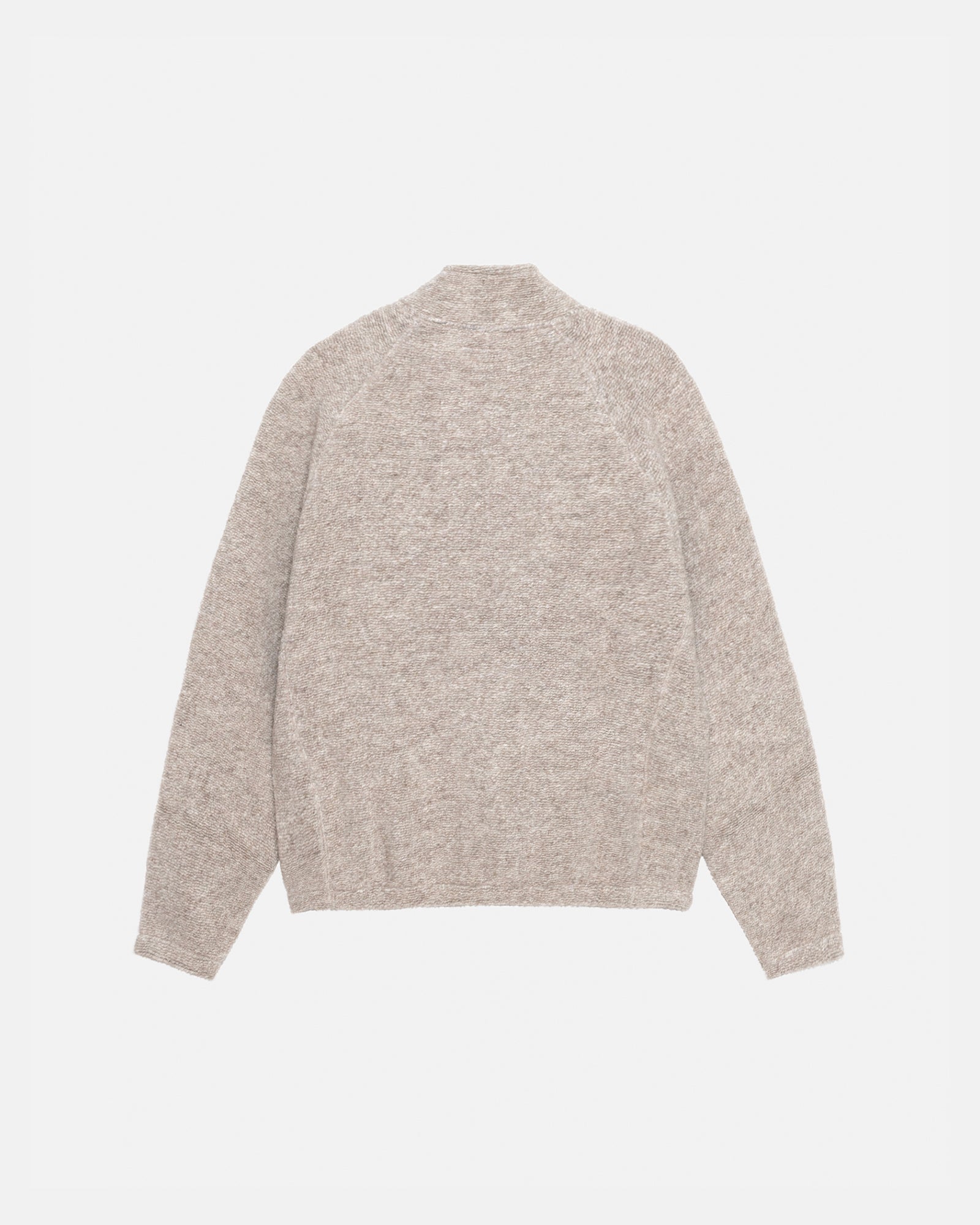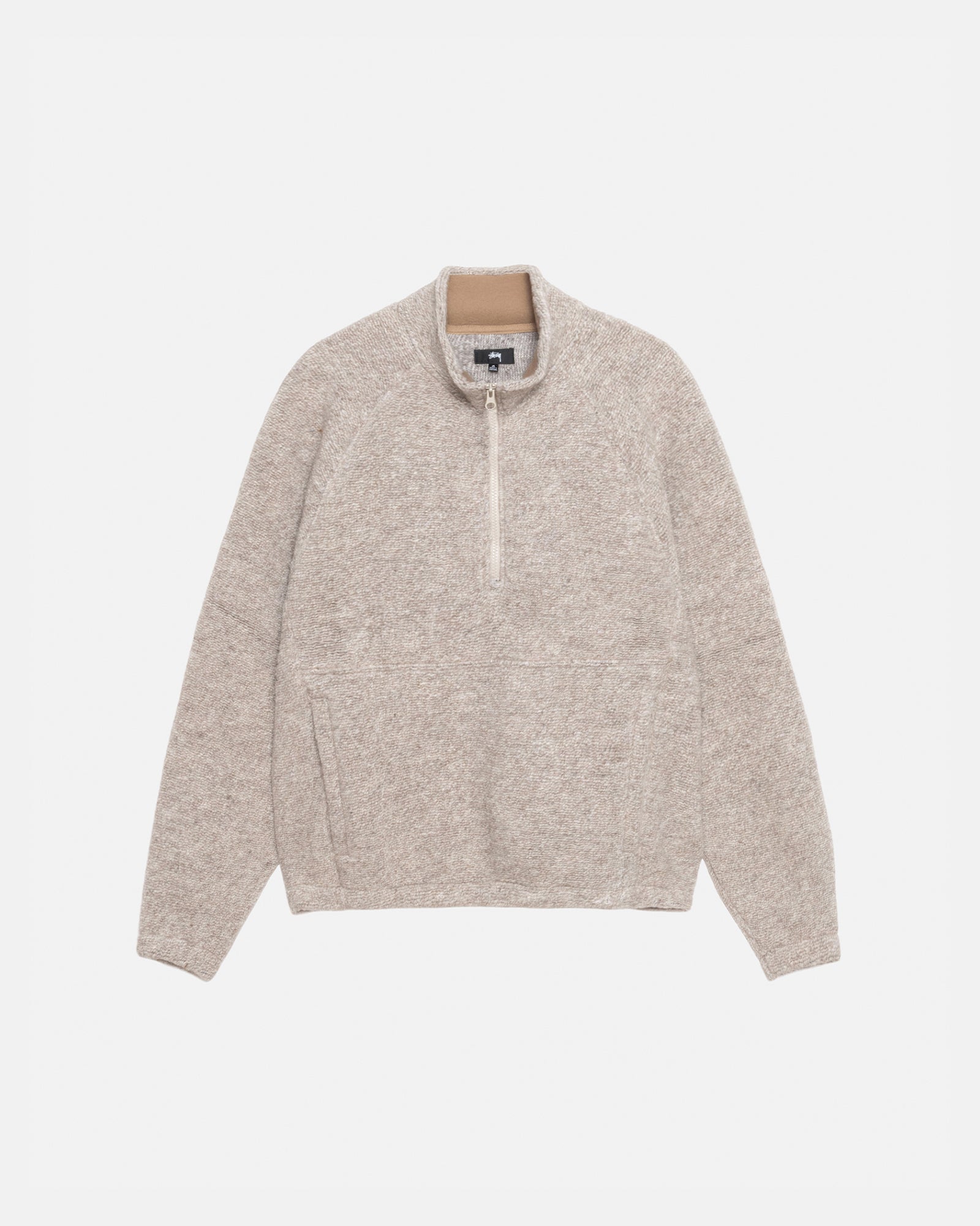 Classic fit half zip in a heavy textured wool cotton blend. Features a mock neck collar and front zip pocket, both fleece-lined.
