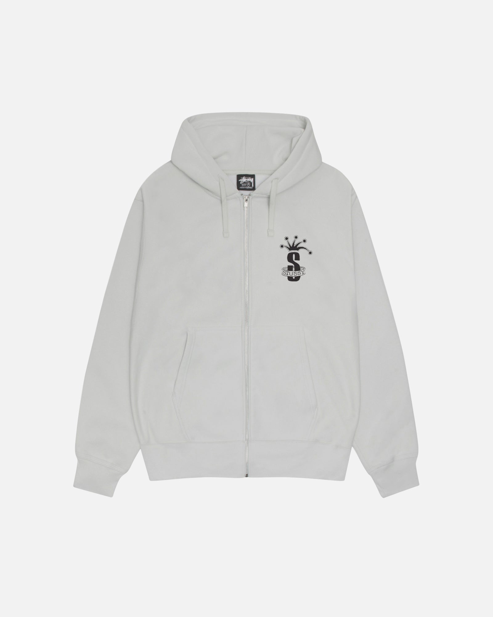 Relaxed zip-front hooded sweatshirt in a heavy 12.7oz cotton blend. Features screenprinted graphics.