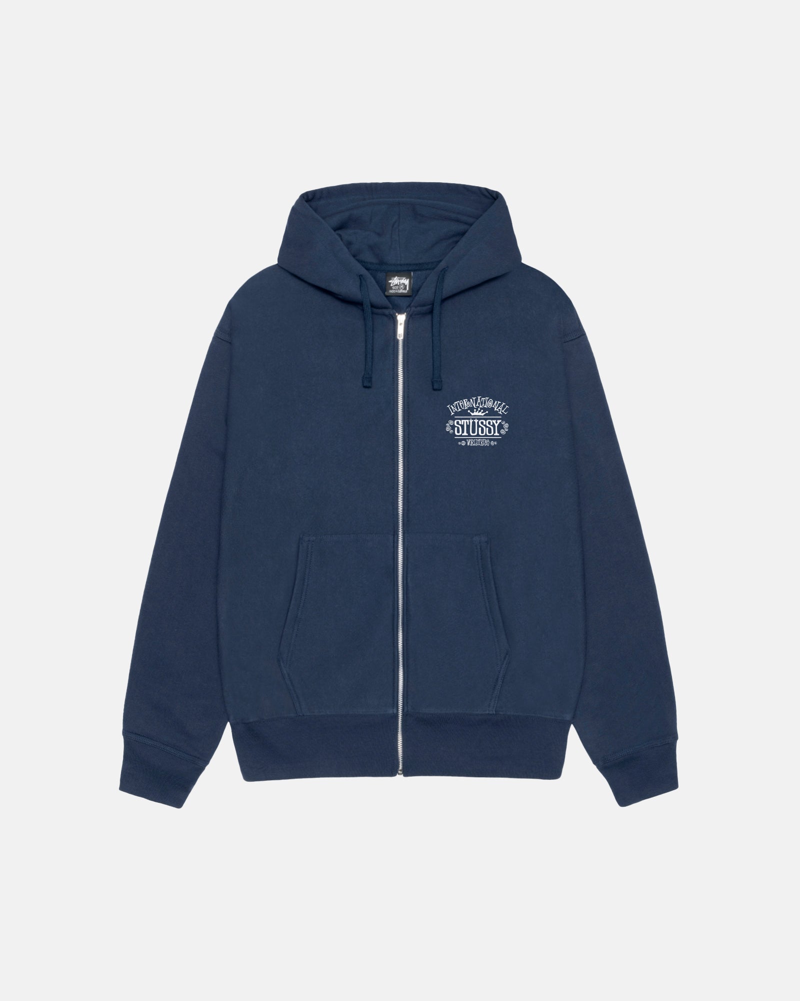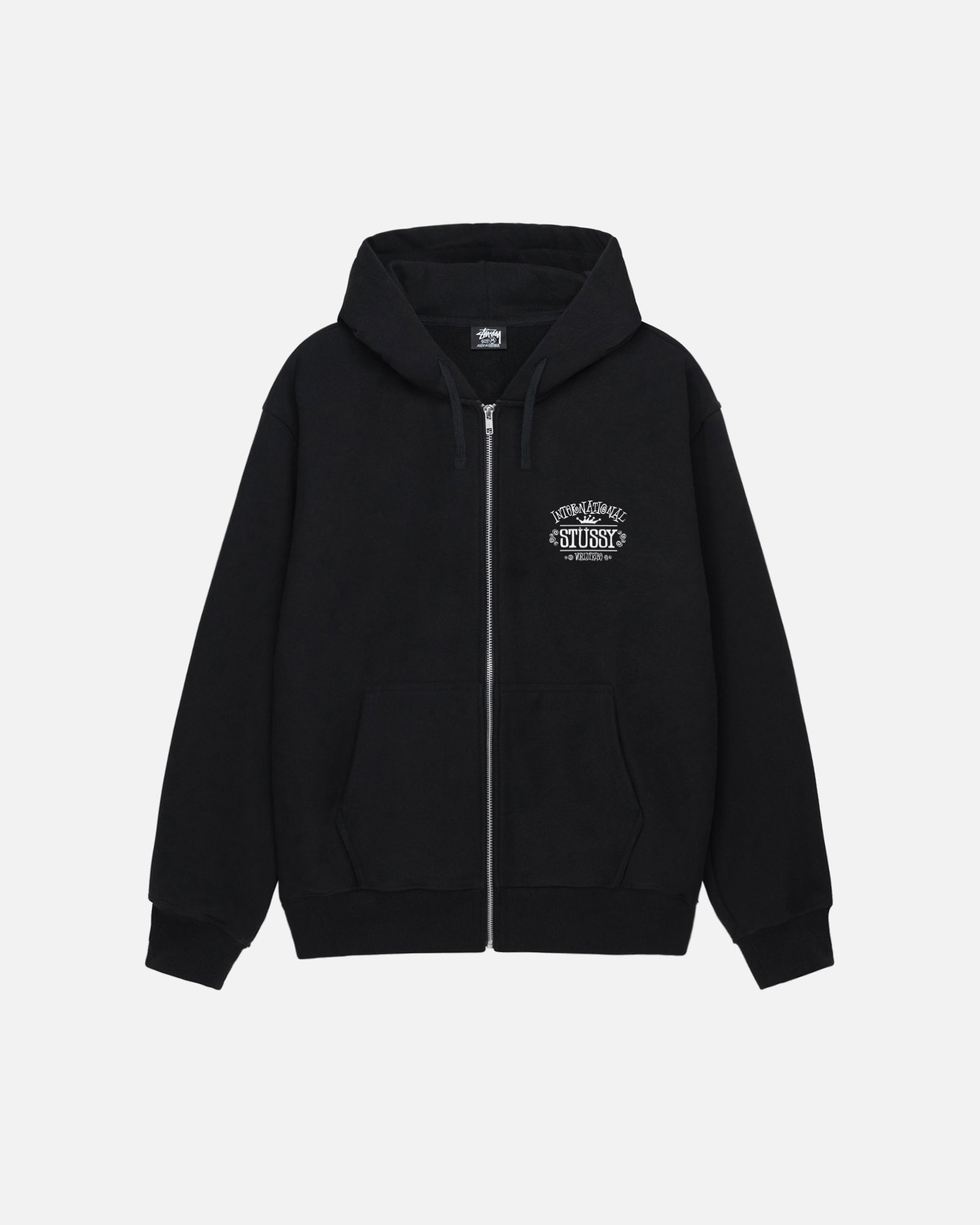 Relaxed zip-front hooded sweatshirt in a heavy 12.7oz cotton blend. Features screenprinted graphics.