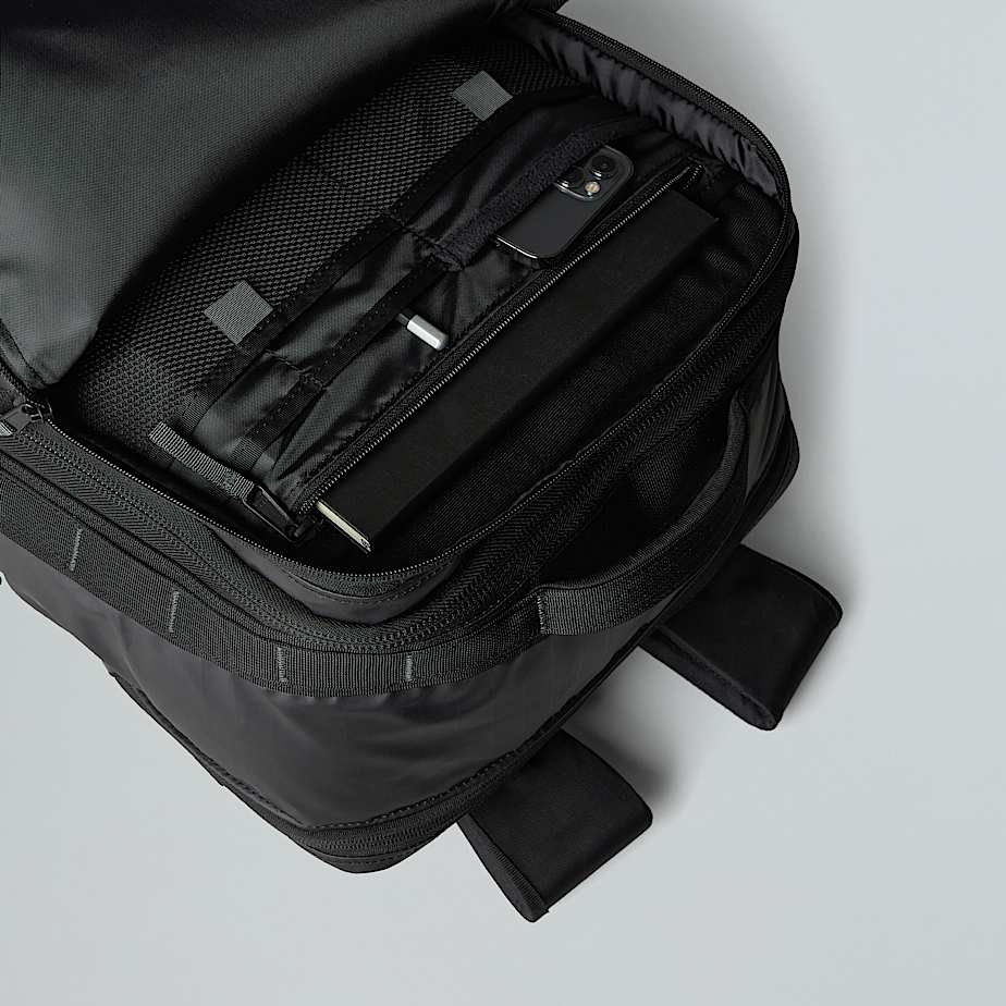 • Inspired by our iconic Base Camp Voyager Duffel, this daypack is just as light and easy to use, with the same focus on travel rather than back-and-beyond expeditions. The shoulder straps and back panel are padded for long-lasting comfort when hanging around at the airport. It's got a padded laptop sleeve, two water bottle pockets, and - to avoid frustrated rummaging - there's an external zipped pocket with organisation for your passport, phone and other travel essentials. There are three padded handles that make hauling the pack a breeze and a luggage pass-through that lets you attach the pack to rolling luggage. Plus, being made from recycled materials, it's a kind choice for nature. Fill it with everything you need for the day's adventures.