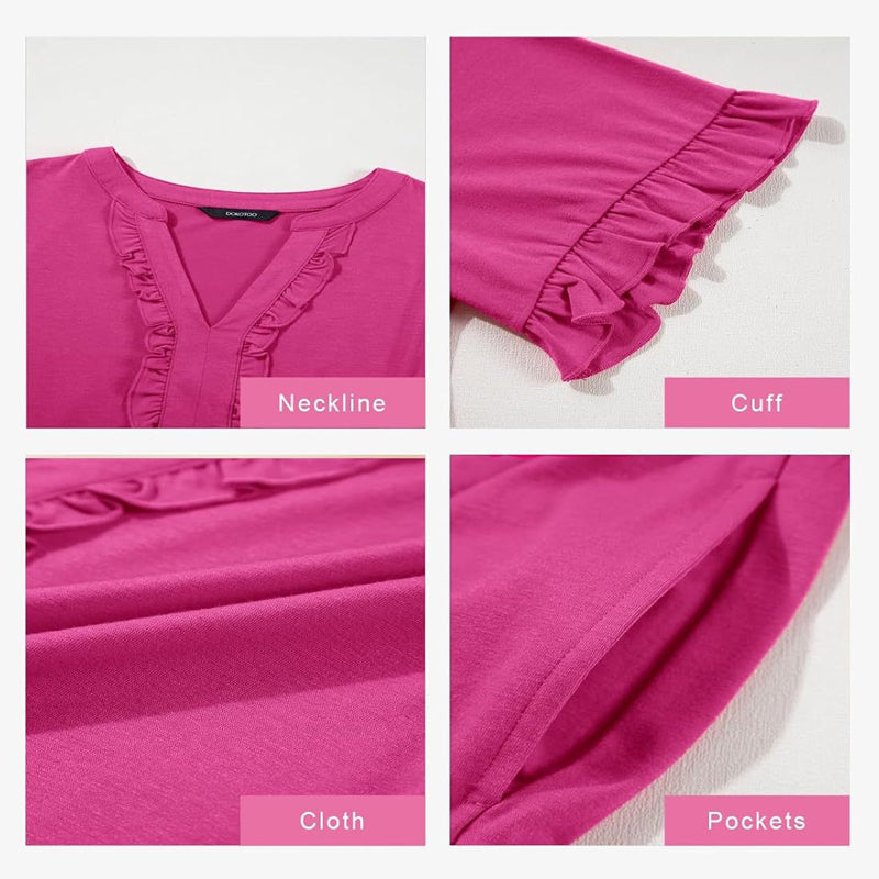 CHARMING RUFFLE DETAILS:The subtle ruffle trim along the V-neckline and hem adds a flirty, feminine touch that enhances the dress's effortless elegance. Perfect for adding personality without being overly flashy.