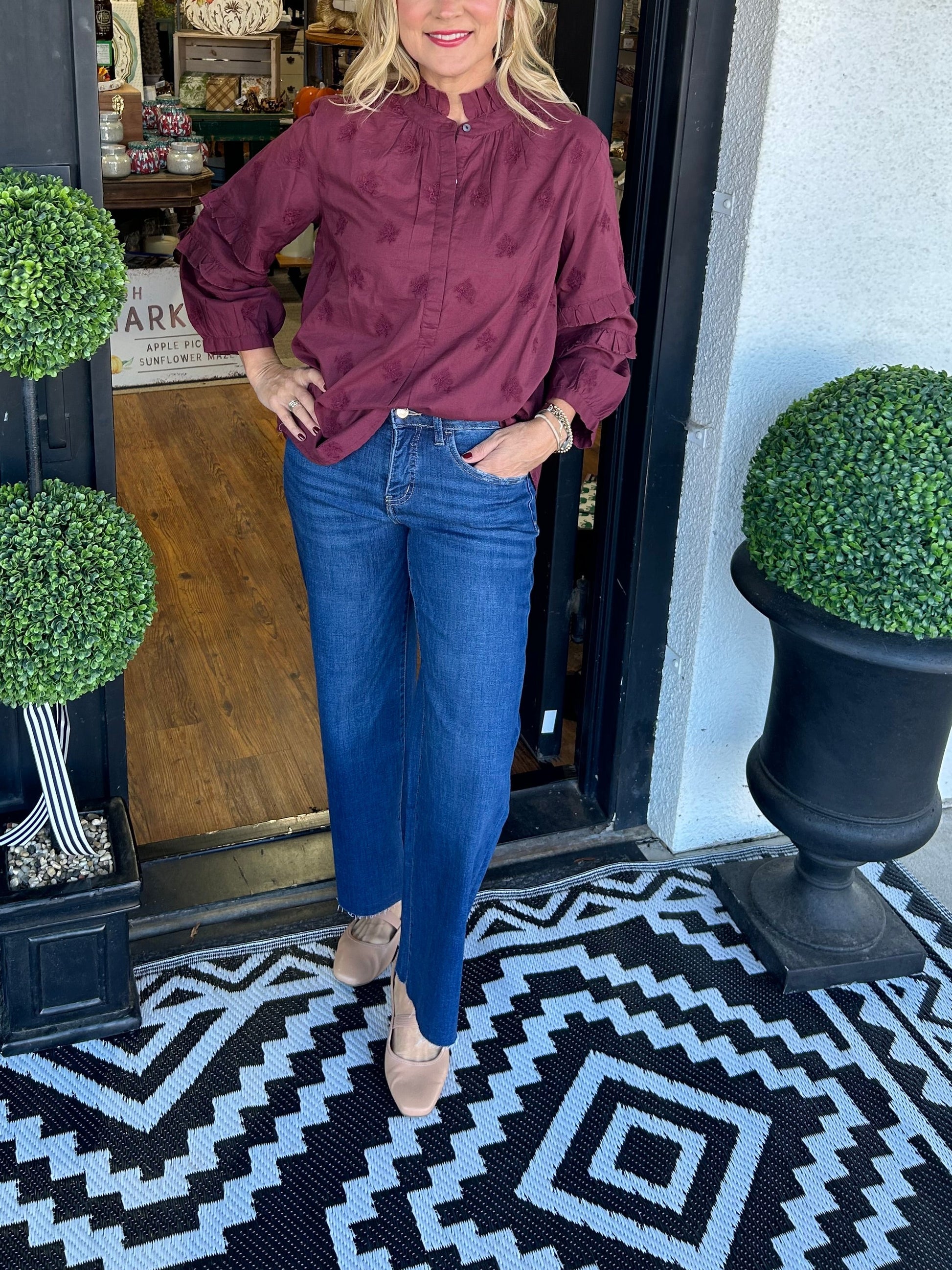 Introducing the Strawberry Blouse: the perfect maroon color for your wardrobe. Add a touch of sweet sophistication with this versatile top that pairs well with jeans or a skirt. Cheers to effortless style and playful charm!